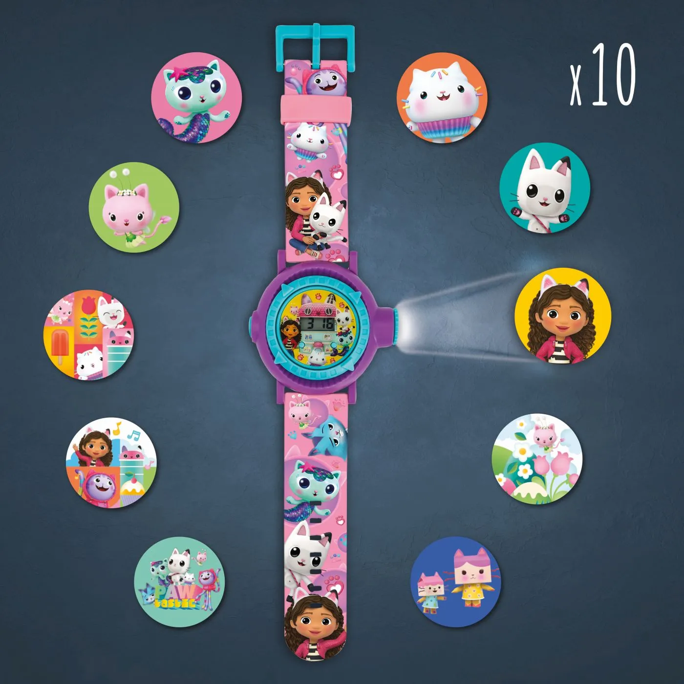 Intra in lumea magica Gabby&rsquos Dollhouse cu ceasul digital cu proiector! Acest accesoriu adorabil nu doar ca afiseaza ora, dar proiecteaza si 10 imagini colorate cu personajele preferate din indragitul serial Netflix. Cureaua este decorata cu motive vesele si culori atractive, perfecte pentru copii. Usor de purtat si plin de surprize, ceasul transforma fiecare moment intr o aventura. Recomandat copiilor de peste 3 ani, acest ceas digital cu proiector este cadoul ideal pentru micii fani Gabby&rsquos Dollhouse.