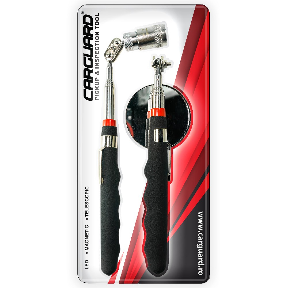Setul Carguard pentru inspecție telescopică include o oglindă telescopică și un instrument de preluare magnetic cu LED, ideale pentru inspecția și manipularea obiectelor în spații greu accesibile. Fabricat din oțel inoxidabil și PVC, acest set oferă durabilitate și versatilitate. Oglinda telescopică se extinde de la 240 mm până la 700 mm, iar instrumentul magnetic de la 240 mm până la 790 mm, permițând accesul ușor în spații înguste. LED-ul integrat asigură iluminare în zonele întunecate, iar setul vine cu 3 baterii LR44 pentru funcționare.