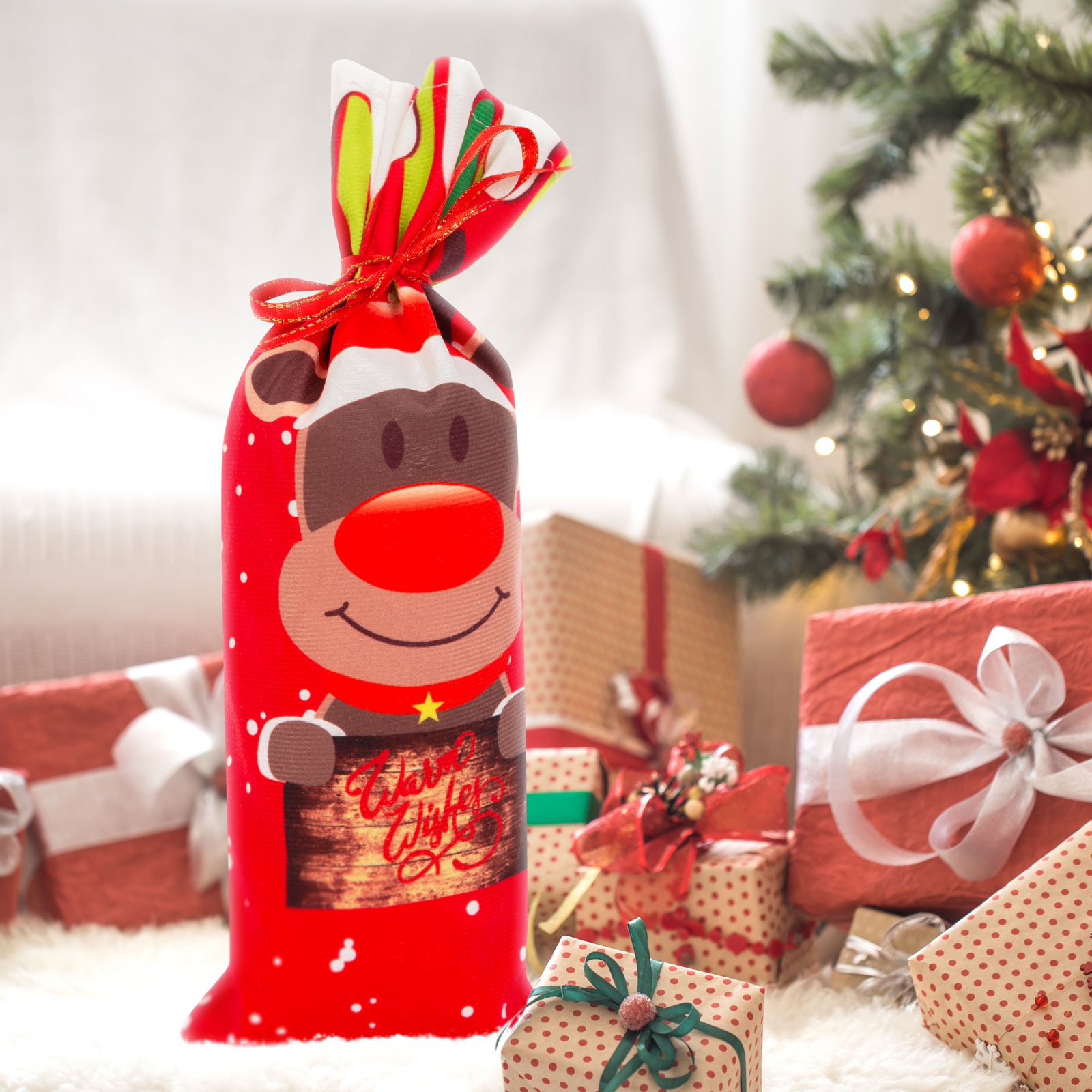 Oferă cadoul de Crăciun cu stil și îmbracă-l într-o ținută pe măsură. Introdu sticlele de băutură în punga de poliester și leagă fundița la gâtul sticlei folosind panglica furnizată!