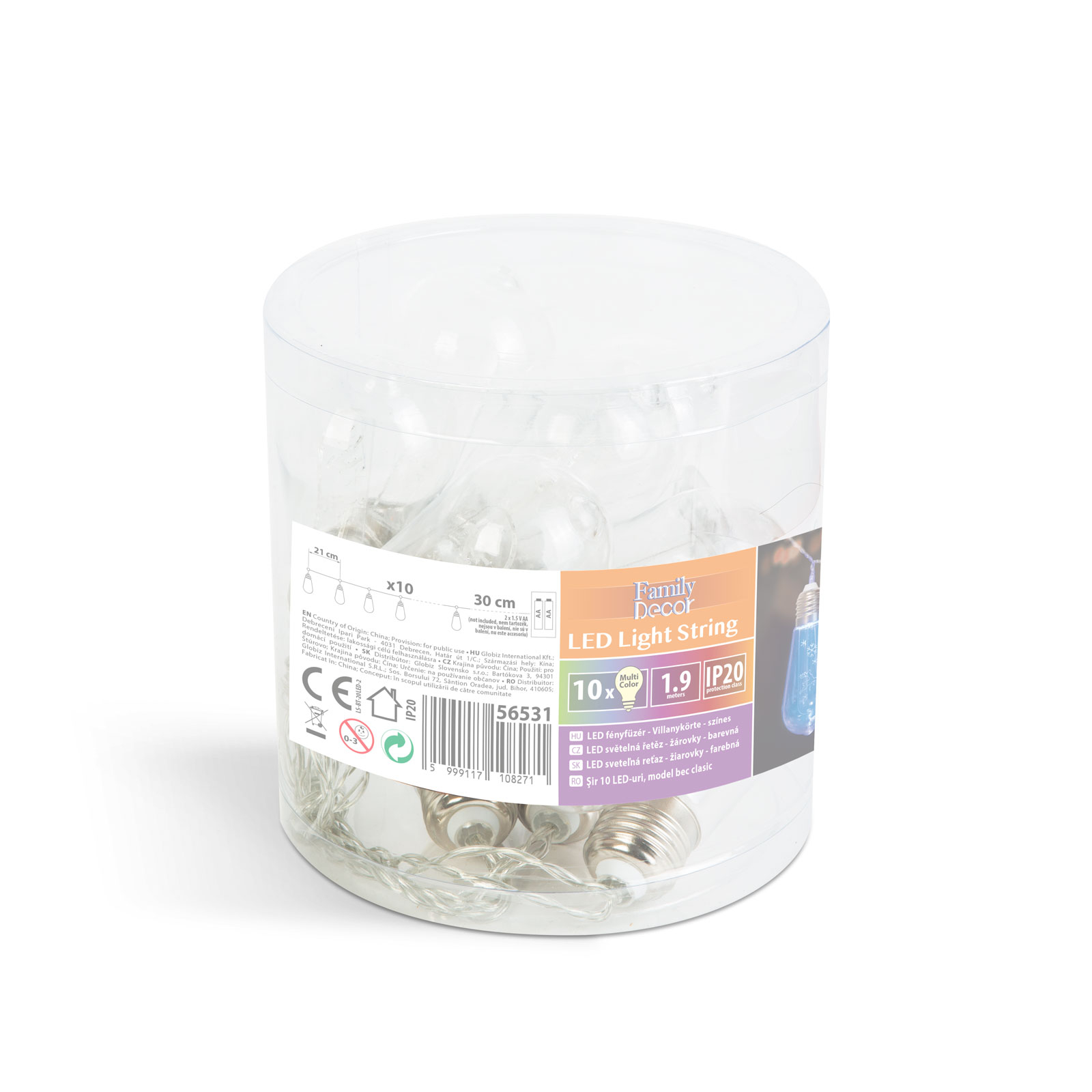 Șir de lumină confortabil cu LED în formă de bec. Cu un model de Crăciun și iarnă în mijlocul becurilor, iluminat de sus de un LED colorat, oferă o experiență vizuală minunată în casa ta din toate direcțiile. Poate fi ideal pentru decorarea pomilor de Crăciun, ghirlande, rafturi, coroane, perdele. Datorită consumului redus de energie al sursei de lumină LED, acesta poate fi acționat cu o baterie pentru o lungă perioadă de timp. Tehnologie LED Formă de bec transparent cu model de ren Funcționarea bateriei Nu necesită curent electric, poate fi amplasat oriunde Nu se încălzește, este sigur Cu cablu transparent, subțire PORNIT / OPRIT Dimensiunea matriței: 112 x 55 mm Sursă de lumină: LED Număr de LED-uri: 10 buc Distanța LED-urilor: 21 cm Culoare LED: Culoare (3 roșu, 2 albastru, 3 verde, 2 galben) Sursa de alimentare: 2 baterii AA 1,5V (nu sunt incluse) Lungimea secțiunii de iluminat: ~ 1,9 m Lungimea cablului la suportul bateriei: 30 cm