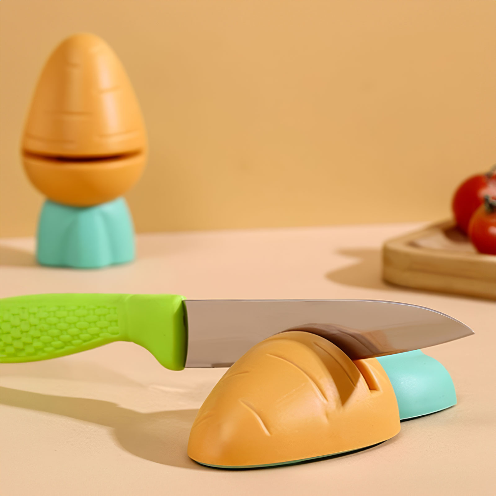 Acest ascuțitor de cuțite în formă de morcov nu numai că îți luminează bucătăria, dar restabilește și ascuțitul cuțitelor de bucătărie. Ascuțitorul de cuțite cu aspectul său practic și unic este garantat a fi favoritul pasionaților de gastronomie. Designul ergonomic, în formă de morcov, nu este doar spectaculos, ci oferă și o prindere confortabilă în timpul ascuțirii cuțitelor. Pietrele de copt de înaltă calitate din interiorul ascuțitorului ascuțesc ușor și eficient diferite cuțite de bucătărie.