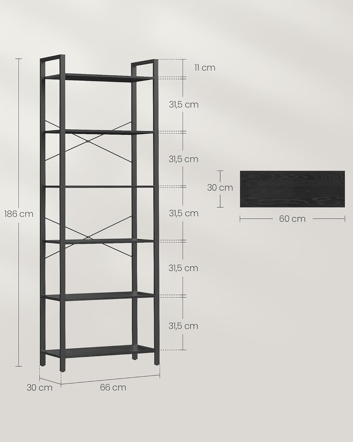 Specificatii tehnice: Brand: VASAGLE Model: LLS062B56 Tip produs: Biblioteca cu 6 rafturi Material: PAL si otel Dimensiuni totale: 66 x 30 x 186 cm (L x A x I) Culoare: Negru  Numar rafturi: 6 Greutate maxima suportata: 60 kg Accesorii incluse: Picioare reglabile, sistem anti-inclinare, bare in X pentru stabilitate Stil: Industrial Intretinere: Curatare cu laveta uscata Scurta descriere: Biblioteca VASAGLE cu 6 rafturi aduce un plus de functionalitate si stil industrial oricarui spatiu. Ideala pentru living, dormitor sau birou, structura sa metalica solida si rafturile deschise din PAL ofera spatiu generos pentru carti, decoratiuni si plante. Caracteristici principale: 6 rafturi deschise pentru organizare eficienta Cadru metalic rezistent cu bare de sustinere in X Picioare reglabile pentru stabilitate pe suprafete neregulate Include sistem anti-inclinare pentru siguranta Design industrial cu finisaj negru mat Asamblare usoara cu instructiuni clare