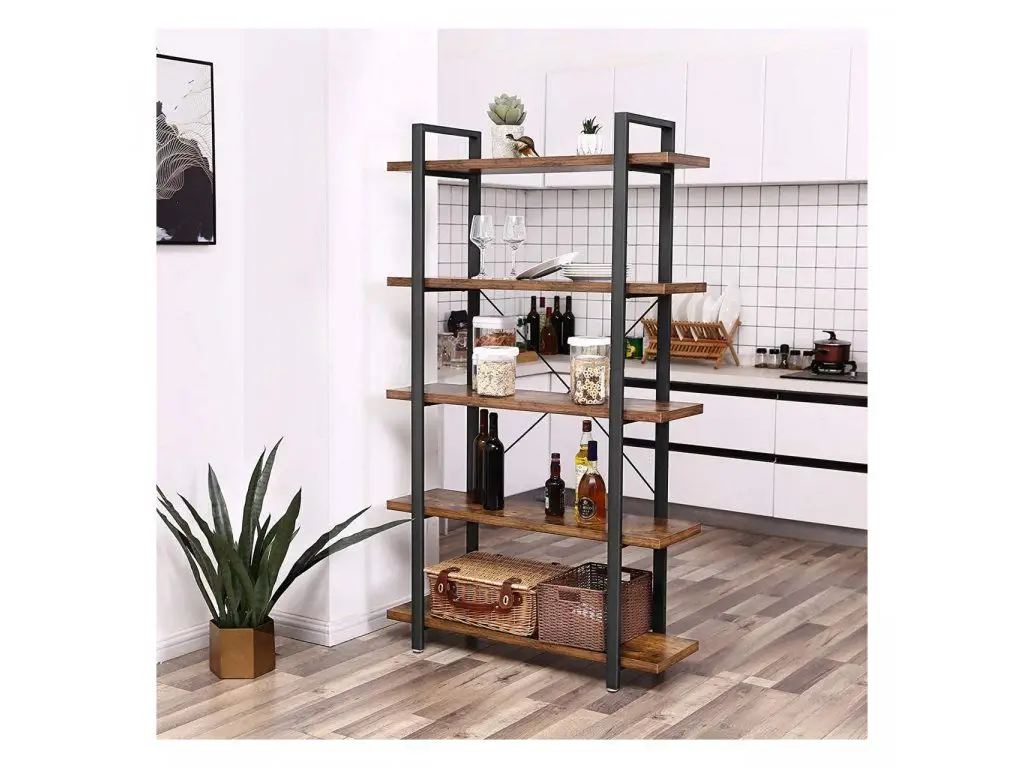 Material: metal, PAL Dimensiune: 105 x 33.5 x 177.5 cm Distanta dintre rafturi: 36 cm Capacitatea maxima de sustinere a unui raft: 30 kg Despre acest articol Aceasta biblioteca de 105 x 33,5 x 177,5 cm cu 5 rafturi deschise va ofera mult spatiu de depozitare pentru a va pastra colectia de carti, pentru a afisa decoratiuni in camera de zi sau pentru a va organiza articolele de bucatarie.Barele in forma de X de pe spate sunt pentru intarire, picioarele reglabile mentin raftul stabil pe podele neuniforme, iar kitul anti-rasturnare previne rasturnarea — stabilitatea si siguranta sunt imbunatatite!Fabricat cu un cadru solid din otel si placi din pal de calitate, acest raft cu 5 niveluri va oferi obiectelor dumneavoastra de colectie un suport de incredere (incarcare maxima de 30 kg pe fiecare nivel) pentru multi ani de acum inainte.Nu trebuie sa va faceti griji cu privire la asamblare! Piesele numerotate si instructiunile ilustrate au simplificat procesul, astfel incat veti avea aceasta unitate de rafturi asamblata fara dificultati.Combinatia dintre scandurile rustice si otelul negru creeaza o biblioteca inalta atragatoare, plina de fler industrial, care aduce atat stil, cat si ordine oriunde o folositi.