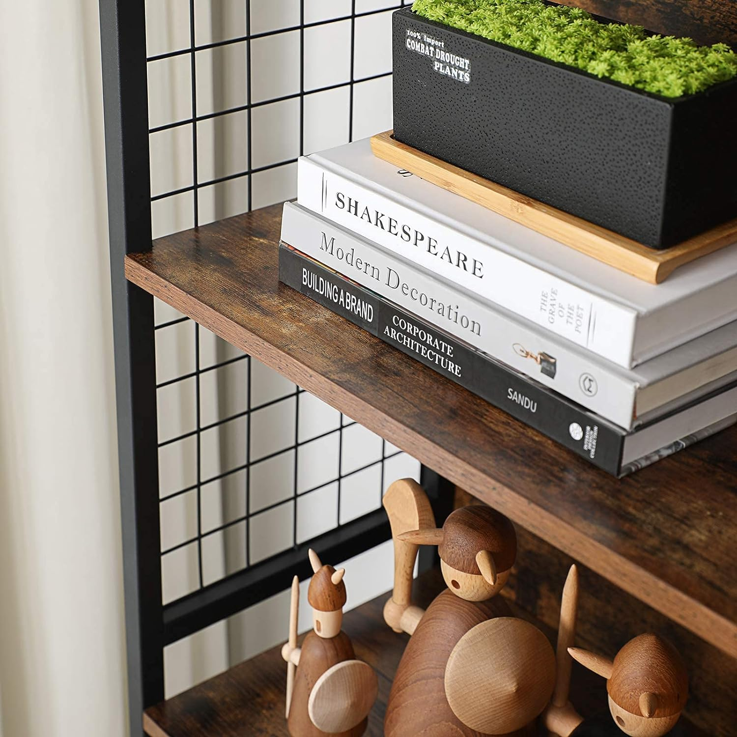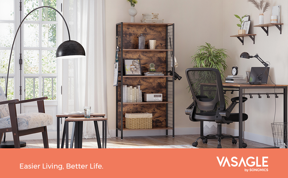 Specificatii: Culoare: Maro rustic, negru Material: Placi aglomerate, otel Dimensiunea produsului: 74 x 30 x 155 cm (L x l x i) Greutatea produsului: 20,5 kg Max. Capacitate de incarcare statica pe nivel: 20 kg Despre acest articol Liniile elegante de culoare neagra mata, designul proaspat al grilei si rafturile maro rustic - toate aceste elemente se imbina pe aceasta biblioteca pentru a adauga o nota placuta spatiului dvs.Acest raft de depozitare este echipat cu 4 carlige in forma de S, astfel incat sa le puteti agata de panourile laterale cu grila si sa tineti la indemana ceea ce aveti nevoie.Cu o surubelnita si o cheie Allen (incluse), nu va trebui sa pierdeti timp cautand alte instrumente de asamblare. Urmati doar instructiunile clare si piesele etichetate, iar biblioteca va fi gata sa va depoziteze cartile in cel mai scurt timp.Sustinut de un cadru solid din otel, placi aglomerate si picioare reglabile, acest raft de depozitare este construit pentru a fi stabil si echilibrat; un kit anti-inclinare se adauga la stabilitatea generala si asigura o utilizare mai sigura.Ce primiti: Un raft de podea cu 4 etajere si panouri laterale din plasa care nu numai ca pot impiedica caderea obiectelor dvs., dar ofera si spatiu suplimentar pentru agatarea obiectelor cu ajutorul carligelor incluse.
