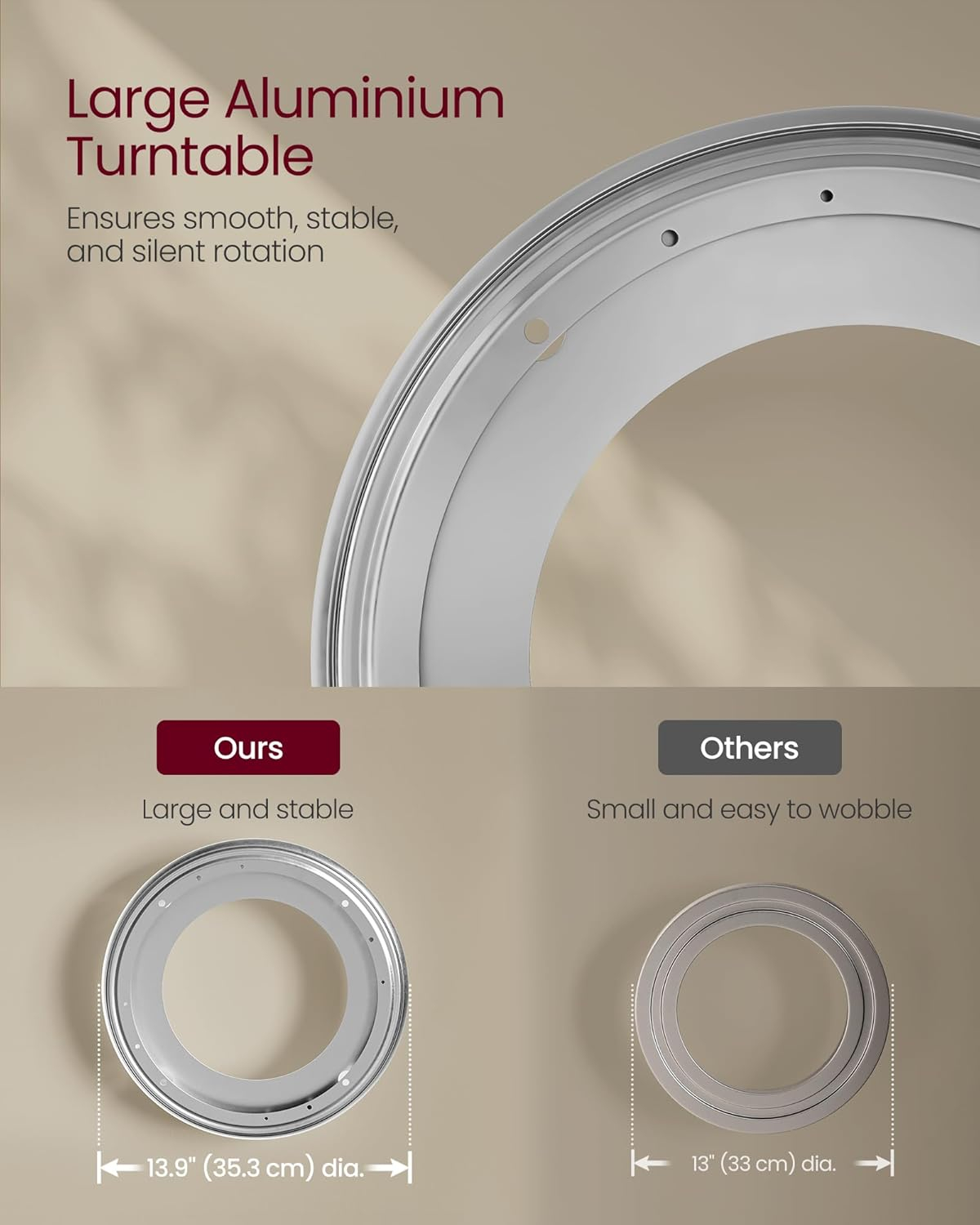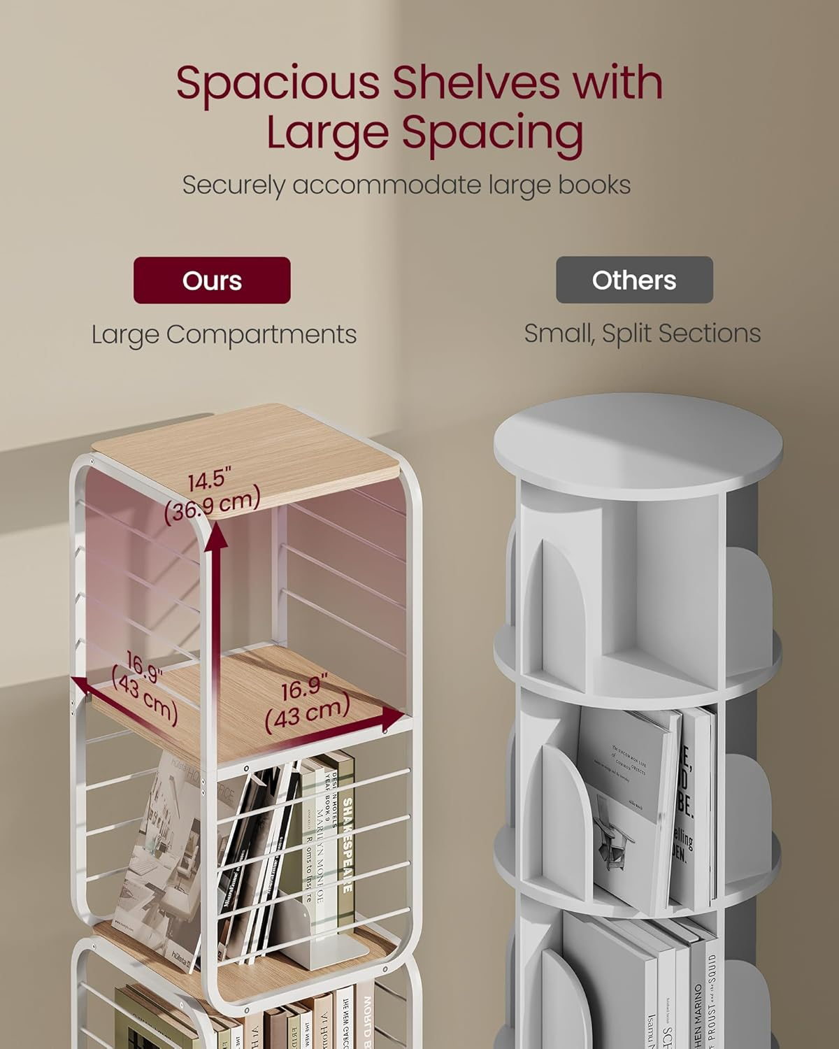 Specificatii tehnice Brand: VASAGLE Model: LLS127W67 Tip produs: Biblioteca rotativa Material: PAL, cadru metalic Culoare: Bej /alb Dimensiuni: 43x43x158 cm Numar rafturi: 4 Capacitate: 80-100 carti de dimensiuni standard Montaj: Independent, cu sistem anti-rasturnare inclus Greutate maxima suportata: 60 kg Caracteristici speciale: Rotatie 360°, opritoare carti, picioare ajustabile Scurta descriere Biblioteca rotativa VASAGLE aduce un plus de functionalitate si design modern in orice locuinta. Cu 4 rafturi spatioase si opritoare pentru carti, ofera acces usor la colectiile preferate si se integreaza perfect in colturi sau spatii mici. Structura din PAL si cadru metalic asigura rezistenta si stabilitate, iar sistemul anti-rasturnare sporeste siguranta. Caracteristici principale Design rotativ 360° pentru acces facil la carti 4 rafturi incapatoare, potrivite pentru 80-100 carti Include opritoare pentru organizare suplimentara Picioare reglabile pentru stabilitate pe suprafete inegale Sistem anti-rasturnare pentru siguranta sporita Compacta, ideala pentru colturi si spatii reduse