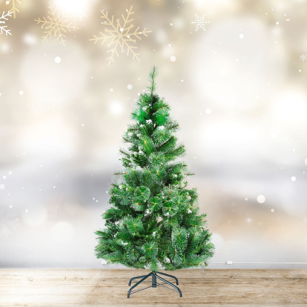 Înveselește atmosfera sărbătorilor cu acest brad artificial de 150 cm, cu ramuri dese și vârfuri înzăpezite. Ramurile bogate, acoperite cu strat alb ce imită zăpada, creează un efect natural și elegant, potrivit pentru orice decor festiv.