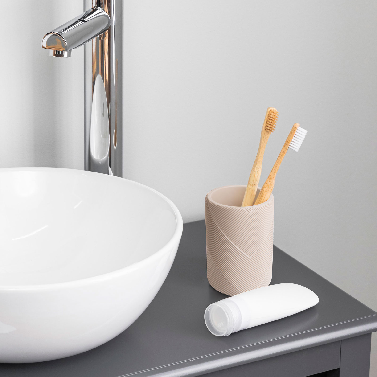 Dacă sunteți în căutarea unei eleganțe curate și a unui design modern, atunci această sticlă de baie bej mat poate fi alegerea perfectă. Suprafața bej mat oferă interiorului băii o notă modernă și elegantă. Sticla din rasina te va incanta nu numai prin aspectul sau, ci si prin durabilitatea si caracterul practic. Materialul este ușor de curățat. Cana de dimensiuni compacte se potrivește cu ușurință în jurul chiuvetei sau pe raftul de baie, astfel încât este întotdeauna la îndemână când aveți nevoie de ea. Fie că este vorba despre o periuță de dinți, pastă de dinți sau alte obiecte mici, poți depozita totul elegant și îngrijit în această cană de baie.