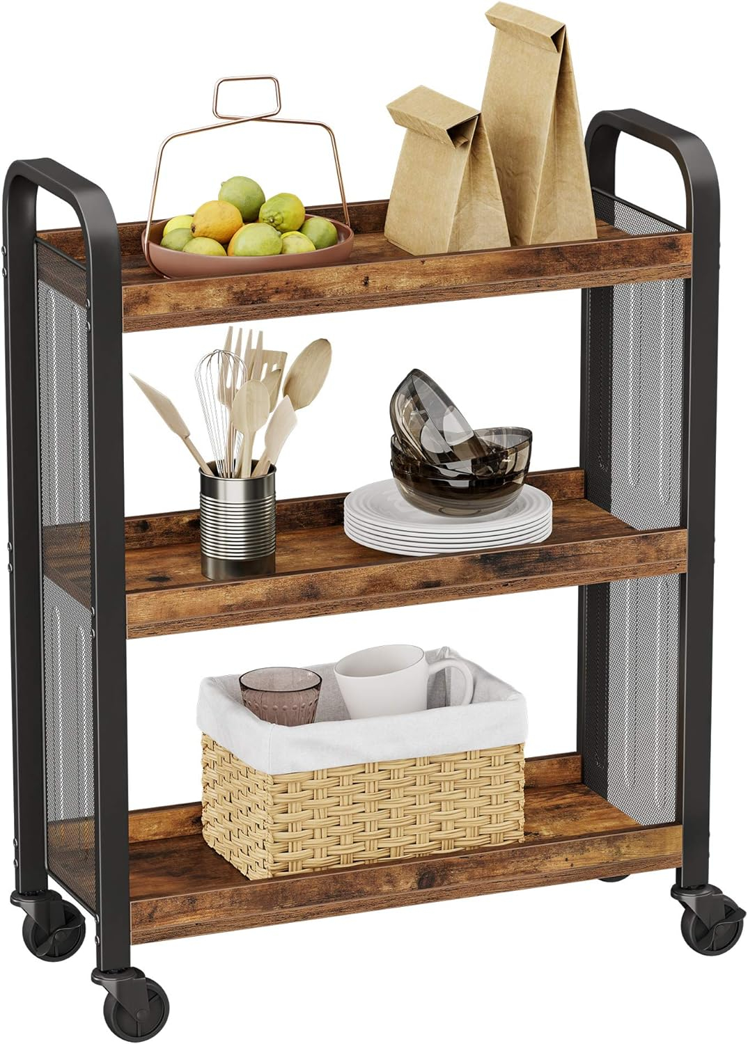 Specificatii: Culoare: Maro rustic Material: PAL, Fier Dimensiune produs: 26 x 66 x 85 cm (L x l x H) Greutate produs: 9,9 kg Max. Capacitatea de incarcare statica a fiecarui raft: 10 kg Continutul pachetului: 1 x C arucior de bucatarie 1 x Kit de accesorii 1 x Instructiuni (EN, DE, FR, ES, IT) Despre acest articol Nimeni nu vrea ca un carucior voluminos sa iti stea in cale atunci cand esti ocupat cu crearea unei retete noi! Acest carucior de bucatarie compact, de 26 x 66 x 85 cm, cu economie de spatiu, cu 3 rafturi utile, va ajuta sa lucrati eficient fara a va ocupa intreaga bucatarie.Care parte va place cel mai mult? Preferi sa scoti in evidenta cele 3 rafturi in maro rustic sau sa scoti in evidenta structura particulara cu plasa laterala de sarma? Fiecare parte iti va atrage privirea indiferent de modul in care asezi acest carucior de servire!Retetele rafinate nu trebuie sa fie complicate! In spatele acestui raft de bucatarie de calitate se afla un design usor de asamblat, care are parti numerotate si instructiuni usor de inteles.Montati cele 4 roti, dintre care 2 cu frane, pentru a glisa caruciorul de bucatarie in sufragerie, sau folositi picioarele reglabile pentru a mentine raftul de bucatarie stationar si stabil langa aragaz; depinde de tine!