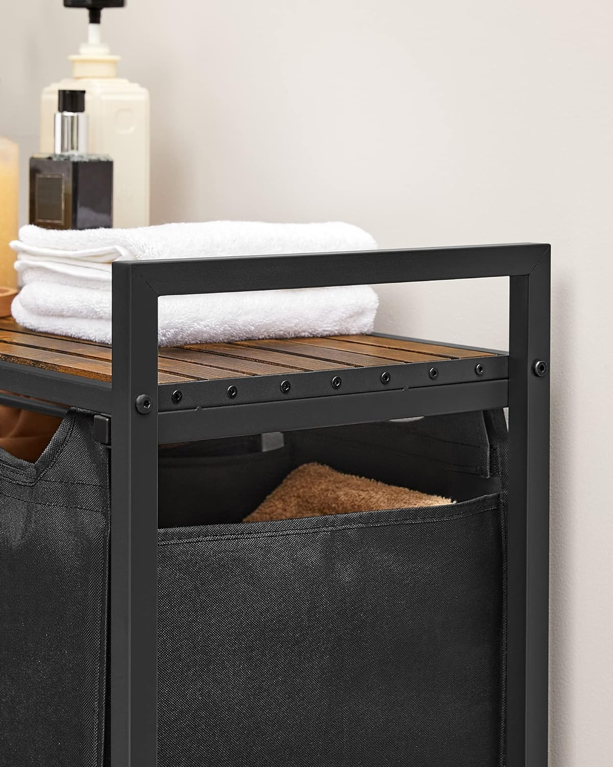 Specificatii: Culoare: Maro rustic, negru Material: MDF (panou din fibre de densitate medie), otel, tesatura Oxford Dimensiunea produsului: 92,5 x 33 x 71 cm (L x l x i) Dimensiuni per sac: 25 x 30 x 51 cm (L x l x i) Greutatea produsului: 8 kg Max. Sarcina statica a raftului: 45 kg Max. Sarcina statica per sac: 8 kg Despre acest articol Cosul de rufe are o capacitate totala de 114L, fiecare captuseala avand o capacitate de 38L. Designul sau cu 3 compartimente va permite sa va organizati rufele in functie de tip si sa separati rufele deschise de cele inchise la culoare.Acest cos de rufe are un raft, oferind spatiu suplimentar pentru a organiza detergentii sau articolele de toaleta. Designul sau cu lamele permite aerului sa treaca prin el pentru o buna ventilatie, prevenind acumularea de mirosuri de la rufe.Fiecare captuseala este echipata cu un panou inferior din plastic pentru a preveni caderea, iar datorita inchiderii cu carlig si bucla, puteti extrage si indeparta fara efort aceste captuseli pentru a le transporta cu usurinta la masina de spalat.Realizat cu un cadru din tuburi de otel de 2 cm si un panou din MDF, acest cos de rufe suporta pana la 20 kg pe raftul sau superior. In plus, fiecare captuseala este fabricata din tesatura Oxford hidrofuga, iar cele patru picioare reglabile asigura stabilitate.Acest sortator de rufe versatil se potriveste perfect in orice camera, fie ca este vorba de spalatorie, baie sau dormitor. Folositi-l pentru a va organiza rufele oriunde aveti nevoie de spatiu suplimentar.