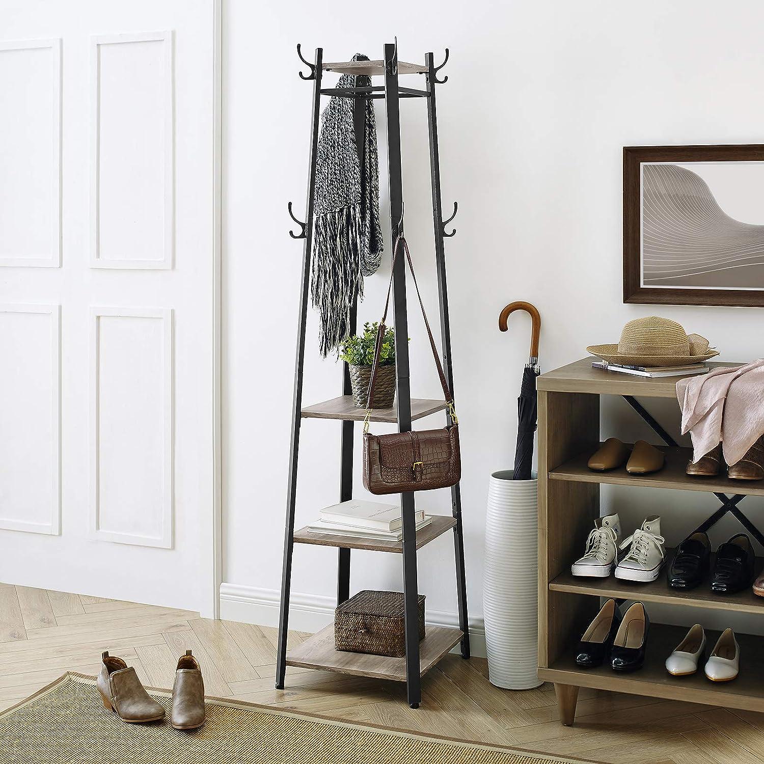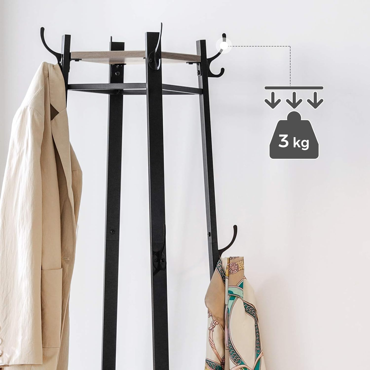 Specificatii: Culoare: Gri, Negru Materiale: Placi aglomerate, otel Dimensiunea produsului: 43 x 43 x 180 cm (L x l x a) Greutatea produsului: 10,6 kg Max. Capacitate de incarcare statica: 10 kg/strat Despre acest articol Carlige, rafturi, sine pentru haine: Carlige duble pentru jachete, esarfe, genti sau palarii, rafturi pentru cutii sau plante mici si sine pentru umerase de haine - acest cuier combina o varietate de solutii de depozitare a hainelor.Otel solid, placi aglomerate de inalta calitate, constructie solida - acest cuier de hol este puternic (rezista pana la 2 kg per carlig dublu, 10 kg per raft).Acest suport de haine pentru holuri este echipat cu picioare reglabile care il mentin stabil chiar si pe podele usor denivelate.Datorita formei conice, suportul pentru haine nu ocupa mult spatiu si se potriveste perfect intr-un colt din hol, dormitor, living sau birou.Piesele clar marcate si instructiunile ilustrate faciliteaza asamblarea acestui suport pentru cuier.