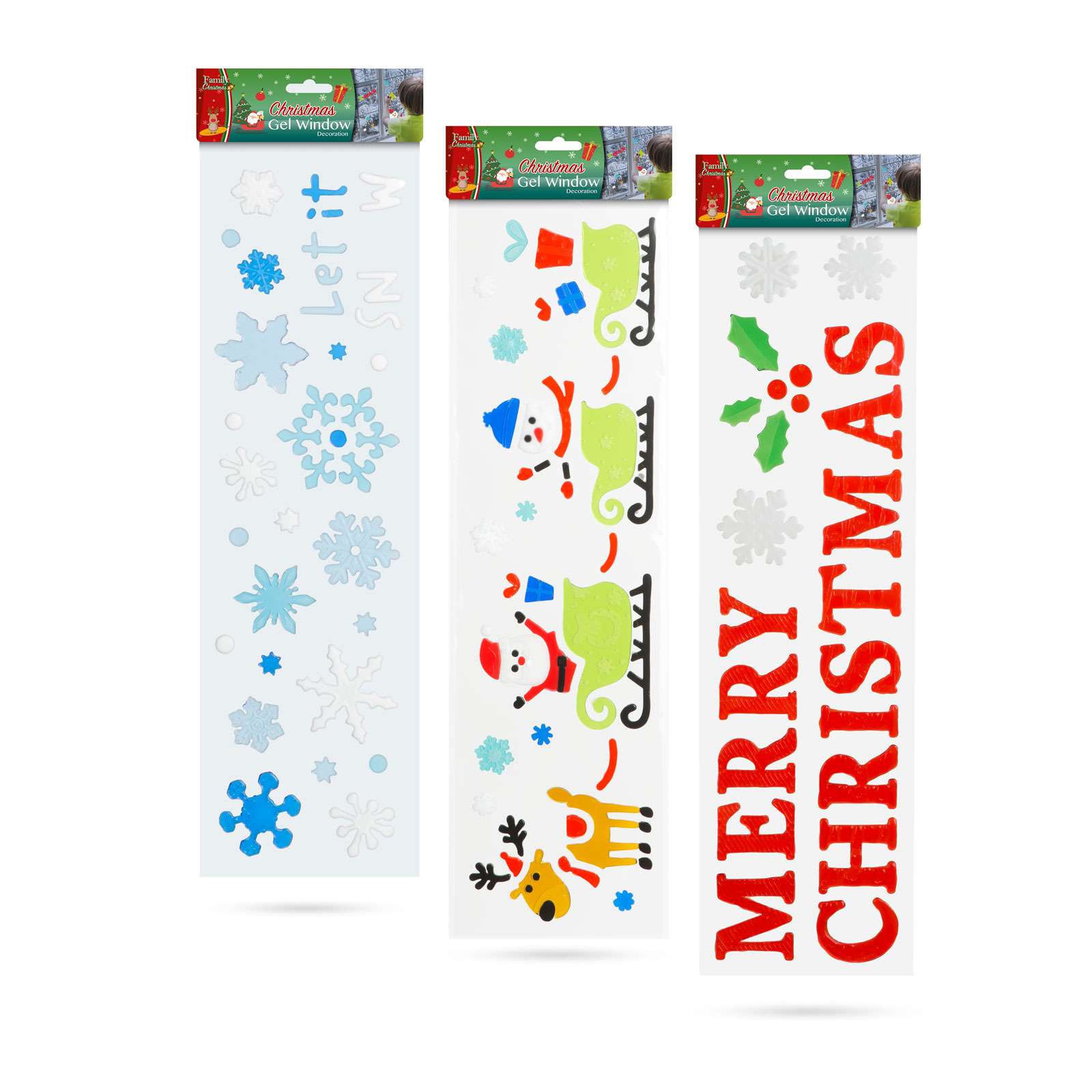 Decor vesel pentru impodobirea ferestrelor de Crăciun. Autocolantele cu gel pot fi lipite separat, astfel încât să poată fi aranjate pe geam după dorință. Ușor de aplicat și îndepărtat fără urmă. Nu conține adeziv, gelul în sine se lipește și poate fi spălat cu apă călduță.