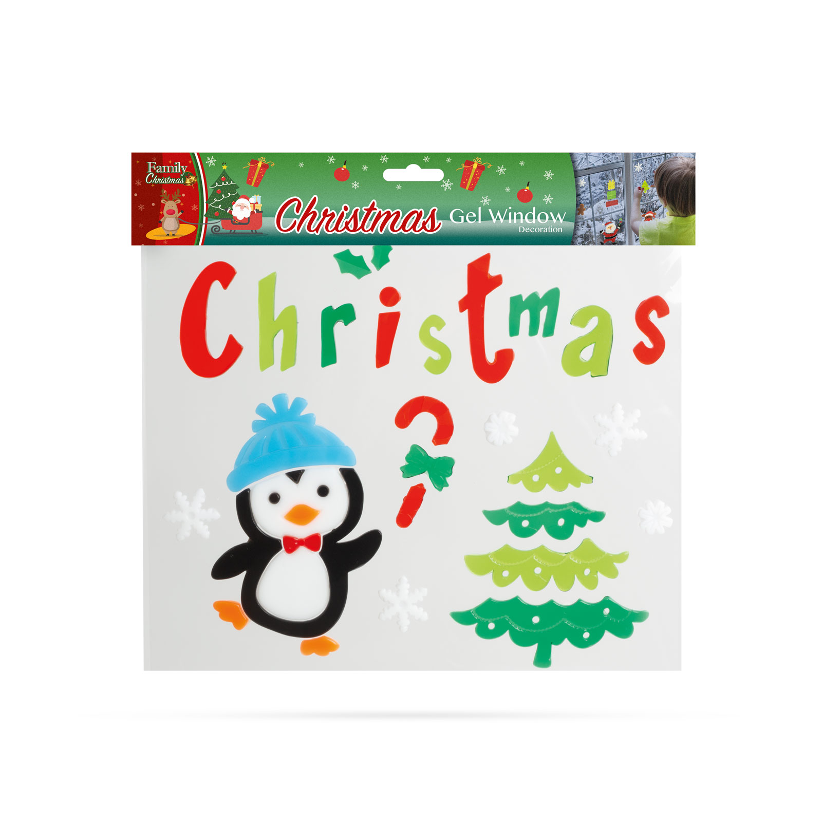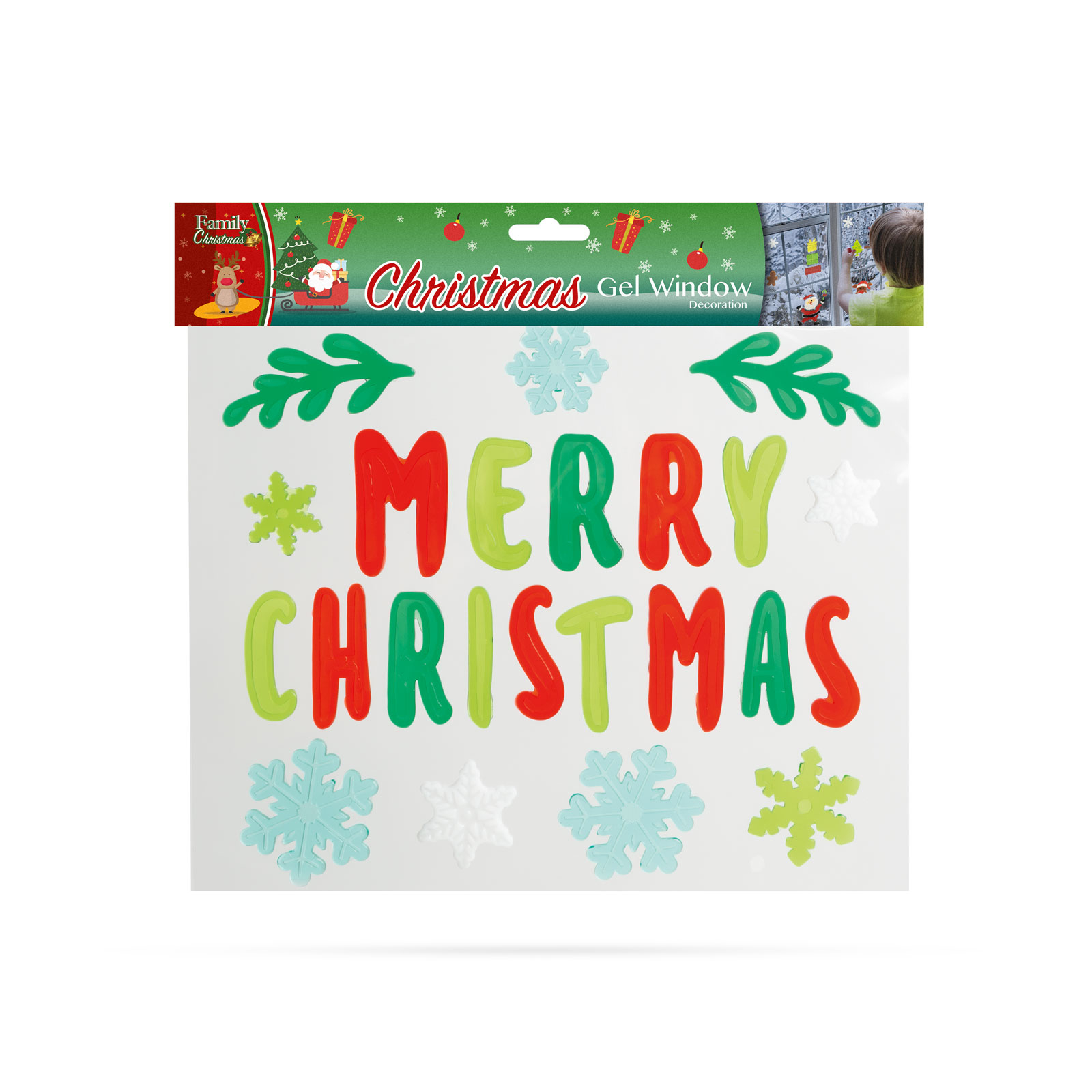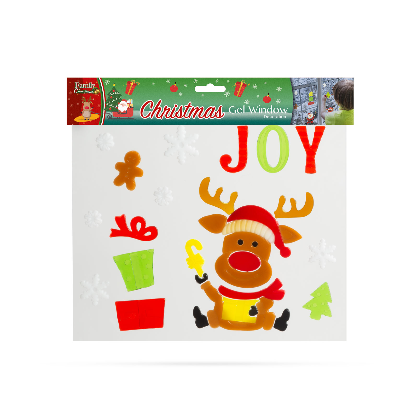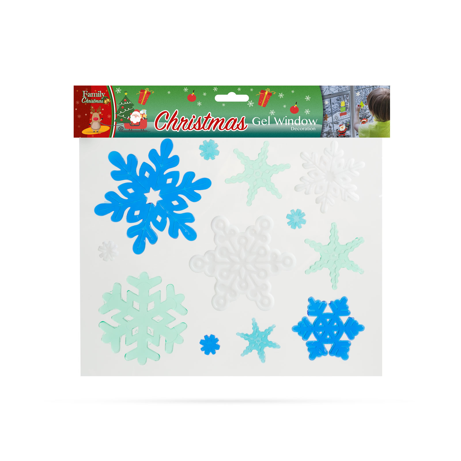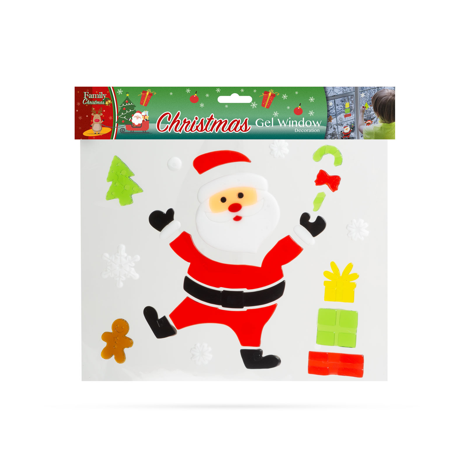 Matriţe decorative vesele de Crăciun, pt. atmosfera de Sărbători. Matriţele pot fi aplicate separat, putând constitui modele unice. Uşor de aplicat, îndepărtare fără urme. Nu conţine adeziv, gelul este adezivul propriu-zis care poate fi spălat cu apă caldă, ca atare se poate reaplica pe geamuri de multiple ori.