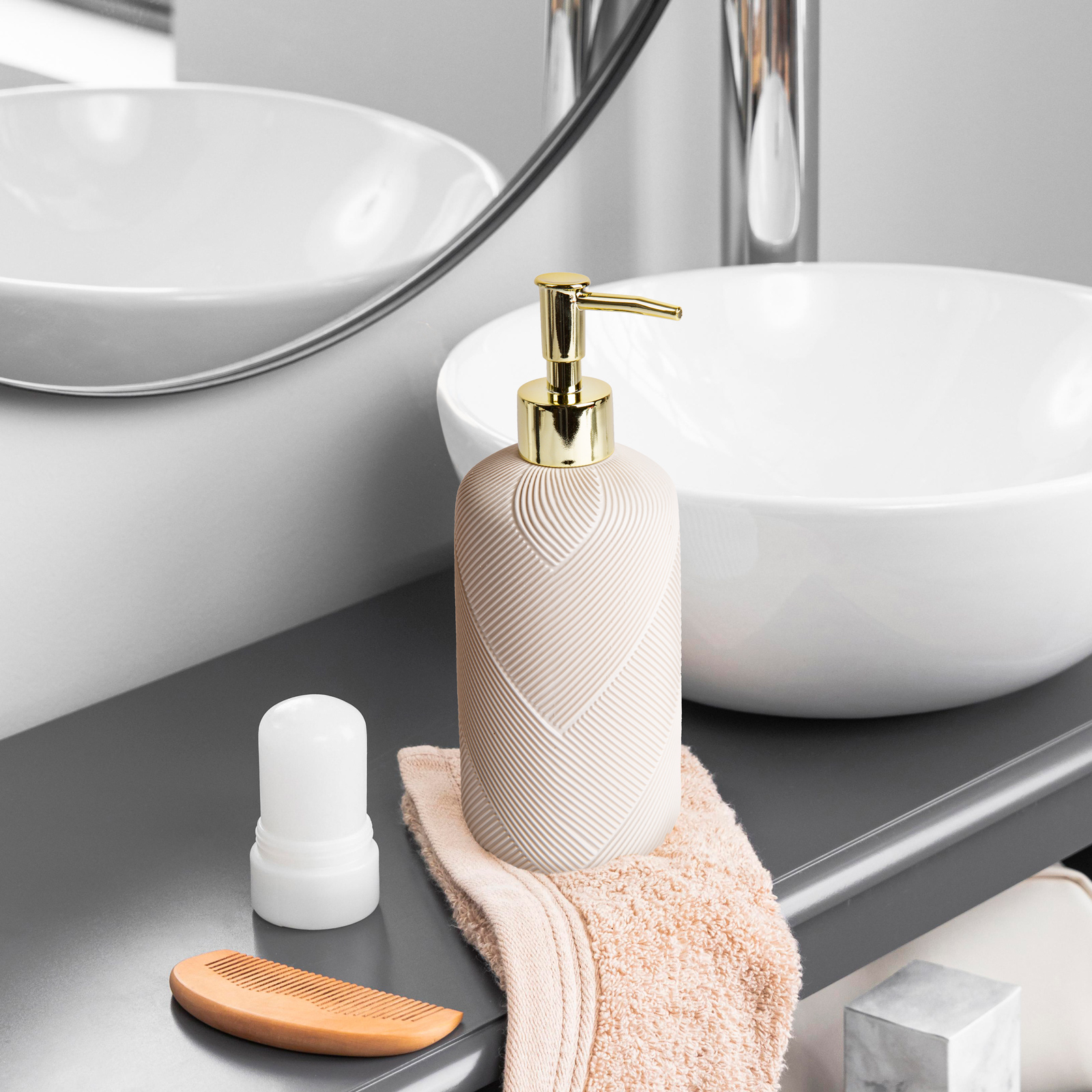 Dacă sunteți în căutarea eleganței și funcționalității în baia sau în bucătărie, acest dozator de săpun cu pompă de mână este alegerea perfectă. Combinația armonioasă a părții bej mat și a pompei aurii garantează un aspect elegant în orice mediu.
