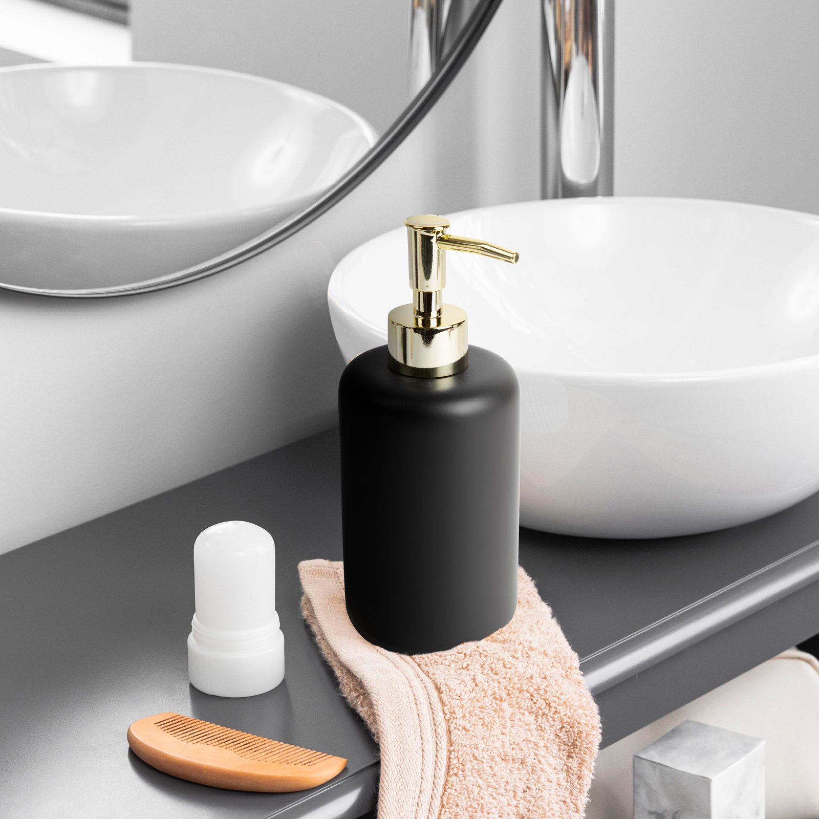 Dacă sunteți în căutarea eleganței și funcționalității în baia sau în bucătărie, acest dozator de săpun cu pompă de mână este alegerea perfectă. Combinația armonioasă a părții inferioare negre mat și a pompei aurii garantează un aspect elegant în orice mediu.