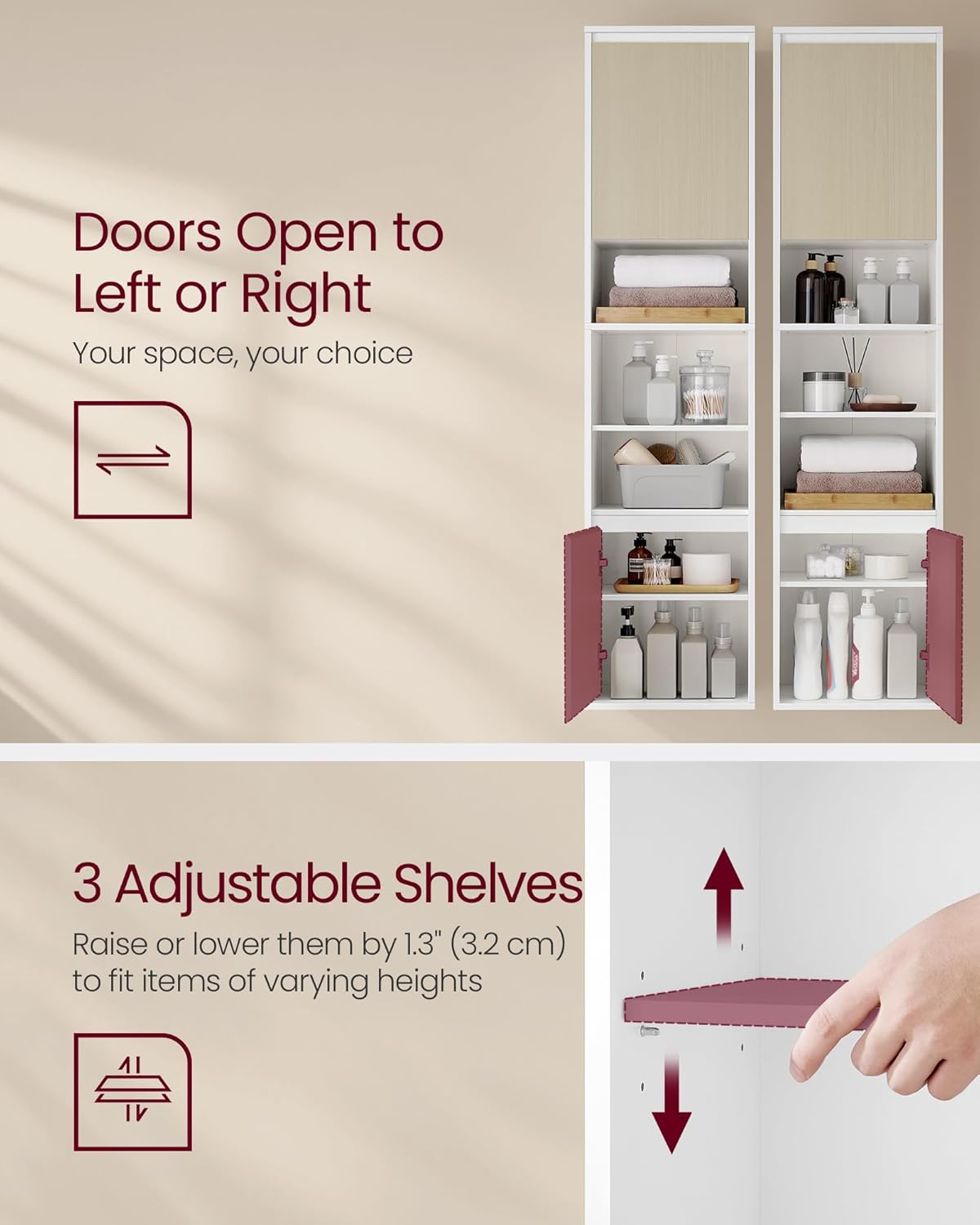 Detalii produs: Culoare: Alb, bej Material: Placi aglomerate din lemn Dimensiuni: 30 x 40 x 160 cm (P x l x i). Capacitate de incarcare statica per raft: 15 kg. Capacitate totala de incarcare statica: 105 kg Note: Acest dulap nu este potrivit pentru peretii din gips-carton. Despre acest articol Usor de curatat podeaua de dedesubt: Deoarece acest mobilier de baie este agatat, lasa spatiu pentru curatarea podelei de dedesubt si previne acumularea de praf si murdarie. Spatiu de depozitare deschis si inchis: Rafturile deschise fac ca articolele utilizate frecvent sa fie usor accesibile, in timp ce compartimentele din spatele usii pastreaza obiectele dvs. intime departe de vedere si ascund astfel dezordinea. Usi flexibile: Puteti monta cele 2 usi ale acestui dulap la dreapta sau la stanga pentru a le adapta camerei si preferintelor dvs.; datorita marginilor tesite, usile sunt usor de deschis si inchis. Spatios si cu rafturi reglabile: Acest dulap de baie ofera 7 compartimente pentru articolele dvs. de toaleta. Are 3 rafturi reglabile la 3 inaltimi pentru a gazdui articole de diferite dimensiuni. Usor de asamblat: Datorita pieselor marcate si a instructiunilor detaliate, puteti asambla acest dulap de baie fara probleme.