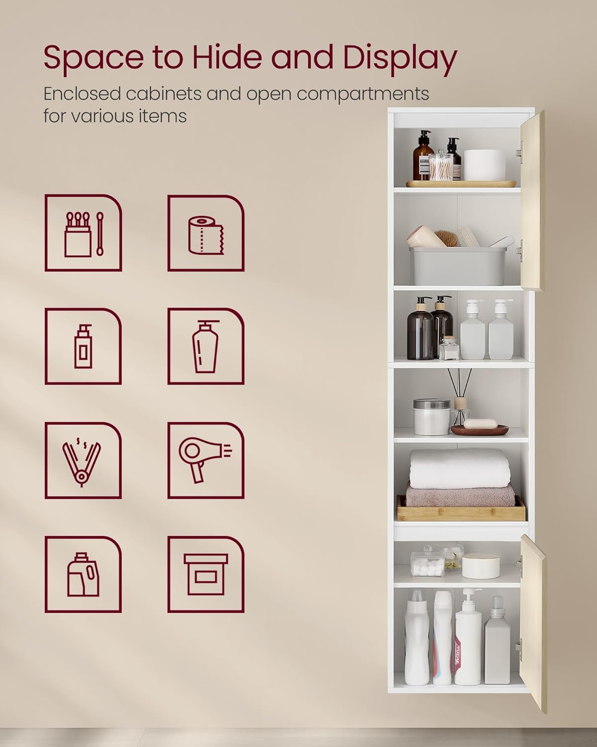 VASAGLE Dulap baie cu montare pe podea sau perete, 7 compartimente, 30x40x160 cm, alb bej