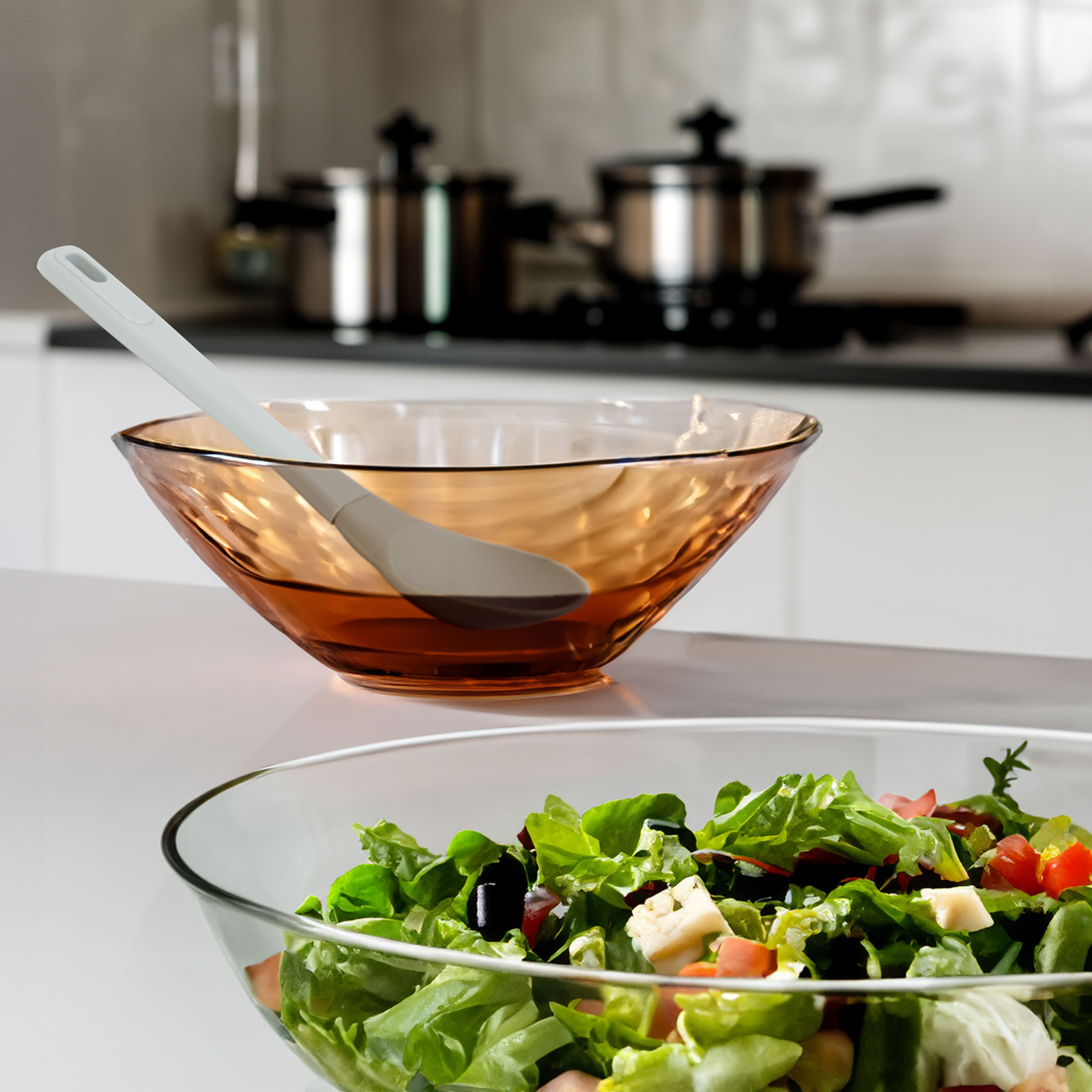 Această lingură din silicon de bucătărie vă face activitățile din bucătărie și mai eficiente și mai plăcute. Mânerul ușor și confortabil din plastic se echilibrează perfect în mâna ta, permițând mișcări precise și netede. Capul din silicon este moale, dar durabil, ceea ce îl face o alegere ideală pentru amestecare. Materialul siliconic este rezistent la căldură și nu zgârie suprafața vaselor, așa că îl puteți folosi în siguranță în timpul gătitului, fără să vă faceți griji cu privire la deteriorare. Capul lingurii poate fi îndoit cu ușurință și se adaptează la forma vaselor, făcându-l posibil să se îndepărteze reziduurile alimentare care s-au lipit de el. Această lingură din silicon de bucătărie nu este doar funcțională, ci și elegantă. Designul modern și materialul ușor de curățat îl fac alegerea ideală pentru a vă completa setul de unelte de bucătărie.