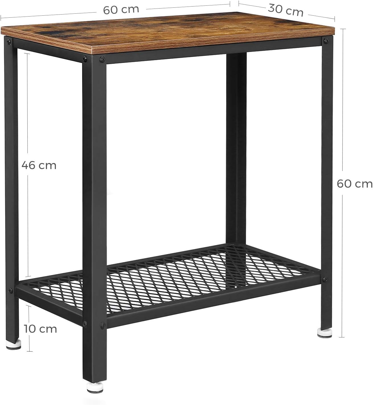 Specificatii: Culoare: Maro rustic, negru Material: Placi aglomerate, otel Dimensiunea produsului: 60 x 30 x 60 cm (L x l x a) Greutatea produsului: 6 kg Capacitate de incarcare statica a blatului de masa: 20 kg Capacitate de incarcare statica a raftului cu plasa: 10 kg Continutul pachetului: Despre acest articol Un cadru din otel negru se intalneste cu materialul din lemn in stil rustic. Adaugati o carte buna si gustari la aceasta masuta laterala - si veti crea atmosfera perfecta pentru a va relaxa dupa o zi aglomerata, cu putin efort.Folositi masuta laterala cu raft din plasa de 30 cm latime in diverse incaperi. Aranjati-o in sufragerie, birou sau hol pentru a va echipa casa cu plante verzi si rame de tablouri. Sau, ce ziceti de o noptiera langa patul dvs.Amestecul solid de otel rezistent si lemn de inginerie rezistent confera noptierei un grad ridicat de stabilitate. Incarcati suprafata cu obiecte de pana la 20 kg, iar raftul din plasa cu pana la 10 kg.Datorita numarului gestionabil de piese individuale, aceasta masa de sufragerie compacta poate fi montata in doar cateva minute