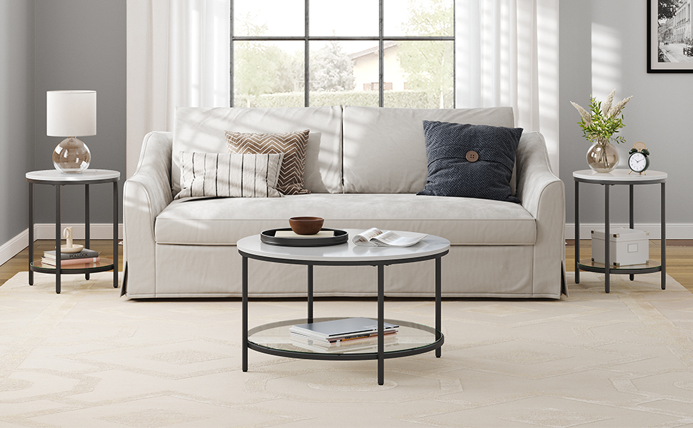 Specificatii: Culoare: alb marmura, negru Material: Placi aglomerate, sticla calita, otel Dimensiune produs: 80 x 44,5 cm (Dia. x H) Greutate produs: 12,4 kg Max. Capacitate de sarcina statica: 20 kg Despre acest articol Stil modern minimalist: blat de masa din marmura alba, raft luminos din sticla securizata dedesubt si picioare elegante din otel negru - totul este o potrivire perfecta conceputa pentru viata ta rafinata.Un membru de incredere al familiei: Nu va bucurati de o masa care nu este robusta? Te simtim! Blatul gros, raftul din sticla calita de sub el, picioarele din otel si partea superioara largita a picioarelor, toate sunt concepute pentru o stabilitate maxima!Usor de asamblat! Indiferent daca te pricepi sau nu la asamblarea mobilierului, datorita instructiunilor usor de urmat si pieselor individuale etichetate, asamblarea acestei masute de cafea cu spatiu de depozitare este usor.Mai mult spatiu pentru depozitare? Da! Bucurati-va de o pauza de cafea relaxanta cu prietenii sau familia si puneti-va revistele, cutiile de depozitare sau florile pe raftul de depozitare de sub masuta de cafea. Va va servi cu placere timpul liber!Ce primesti: o masuta de cafea cu un aspect fermecator, un raft de sticla de jos pentru depozitare suplimentara si o idee grozava de a-ti organiza si impodobi camera de zi.