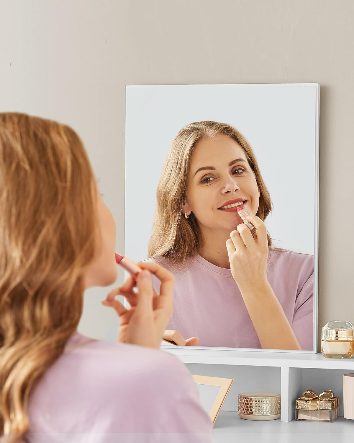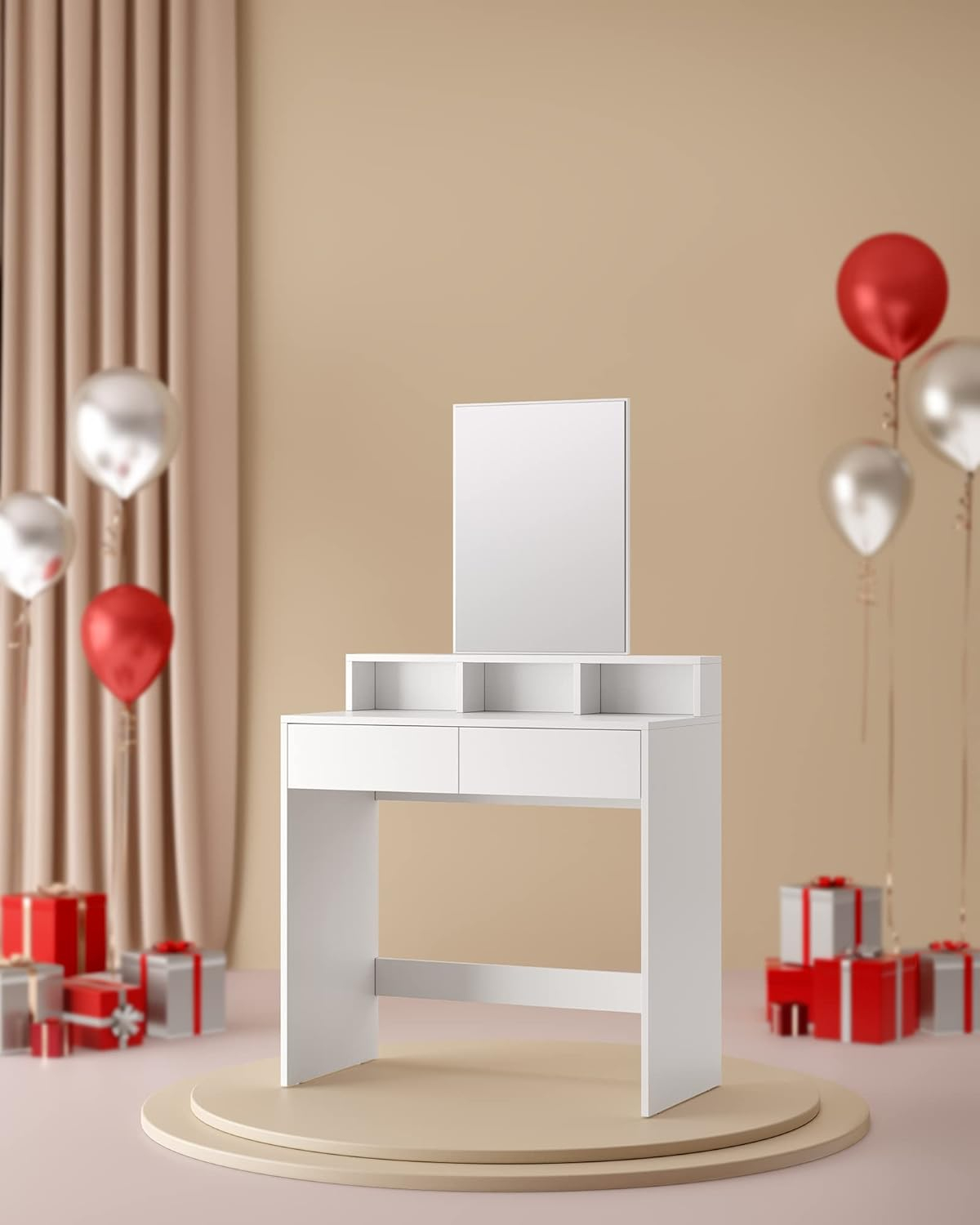 Atentie! Nu sunt incluse scaunul, decoratiunile, etc Culoare: Alb Noi Dimensiune :40 x 80 x 140 cm Dimensiunile produsului: 40D x 80W x 140H cm Finisaj mobila: Alb Marca: VASAGLE Despre acest articol Spatioasa, dar care economiseste spatiu: Avand 2 sertare, 1 raft mare si 3 compartimente deschise, aceasta masuta de toaleta ofera o multime de spatiu pentru a va pastra cosmeticele in ordine si la indemana. Ocupand doar 40 x 80 cm de spatiu pe podea, este perfecta pentru spatiile mici.Oglinda mare, transparenta: Oglinda mare de 40 x 53 cm (L x H) a acestei mese de machiaj va permite sa va verificati clar si sa obtineti o aplicare impecabila a machiajului.Kit anti-inclinare pentru o siguranta sporita: Fixati aceasta masa de machiaj la perete cu kitul anti-inclinare furnizat pentru a crea un mediu mai sigur pentru familia dvs.Stil simplu, modern: Designul simplu, liniile curate si culoarea alba eleganta se combina in aceasta masa de machiaj pentru a va infrumuseta dormitorul.Robust si usor de curatat: Fabricata din placi aglomerate de calitate, aceasta masuta de toaleta este robusta si durabila. Suprafata furnirului face ca aceasta masa sa fie rezistenta la uzura pentru o utilizare de lunga durata si usor de curatat.