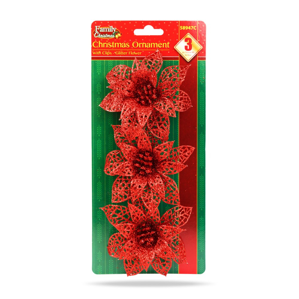 Ornament de Crăciun - cu cleme - floare cu sclipici - roșu - 3 buc/pachet