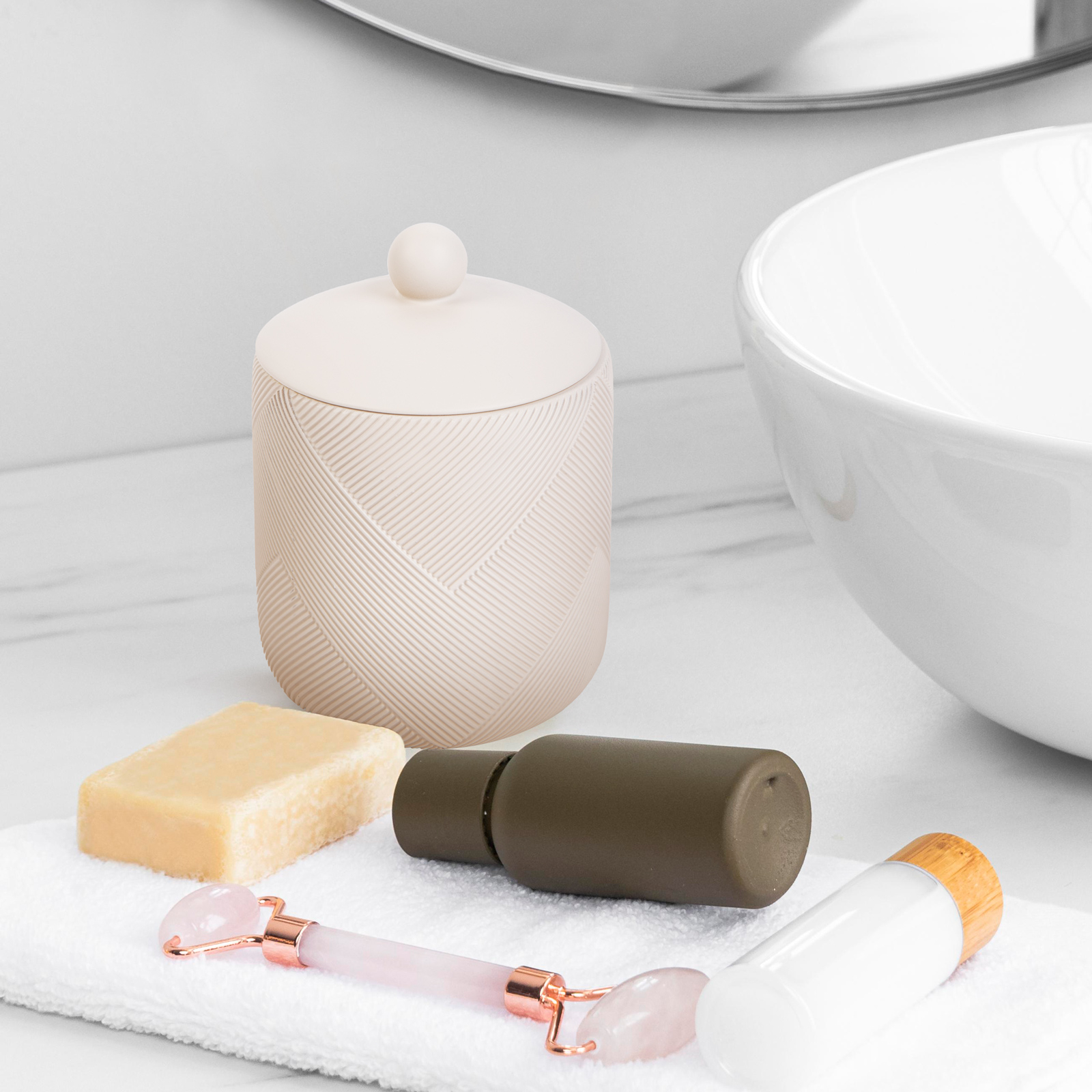 Dacă doriți o eleganță curată și un design modern, atunci acest paharde baie bej mat poate fi alegerea perfectă. Suprafața cu model bej mat oferă interiorului băii o notă modernă și elegantă. Cupa din rasina te va incanta nu doar prin aspectul sau, ci si prin durabilitatea si caracterul practic. Materialul este ușor de curățat. Spațiul de depozitare compact se potrivește cu ușurință în jurul chiuvetei sau pe raftul de baie, astfel încât să fie întotdeauna la îndemână atunci când aveți nevoie de el. Fie că este vorba despre șervețele, cosmetice sau alte articole mici, puteți depozita totul elegant și îngrijit în acest pahar de baie.