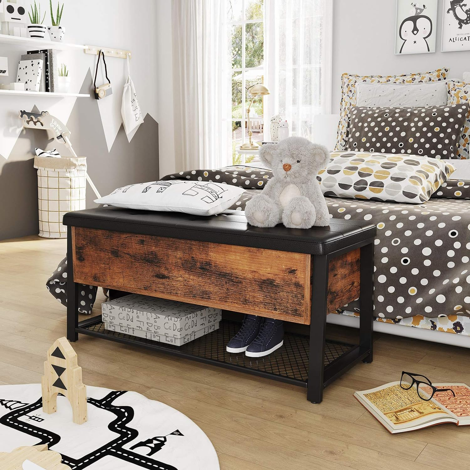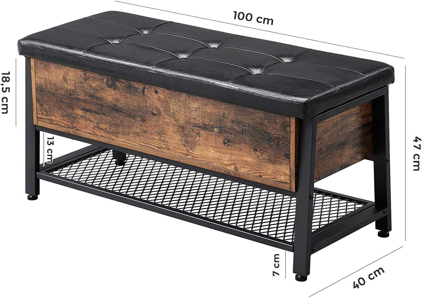 Culoare: Vintage Material: spuma, piele PU, PAL din lemn, fier. Dimensiune: 100 x 40 x 47 cm (L x l x H) Prezinta stilul Chesterfield cu tesaturile sale clasice si captuseala tapitata. Aceasta banca de pantofi cu suprafata din PU usor lucioasa este un must-have daca esti fan al celebrelor modele englezesti. Cadrul din otel negru si elementele rustice din lemn ii confera un plus de farmecCu un compartiment ascuns: Sub zona mare de relaxare se afla un compartiment spatios pentru toate accesoriile si o balama de siguranta care tine cutia deschisa. Raftul robust cu zabrele de dedesubt ofera si spatiu de depozitareCauti sfaturi despre mobilier? Aceasta piesa de mobilier este perfecta pentru a fi folosita ca banca de pantofi pe hol sau ca capat de pat in dormitor. Aceasta banca de depozitare adauga, de asemenea, o nota cosmopolita oricarui birouDesign simplu de asamblare: datorita structurii simple a bancii de depozitare, cheii hexagonale si surubelnitei incluse, asamblarea se face in cel mai scurt timpCe primesti: Fabricata din PAL si otel, captusita cu spuma, aceasta banca durabila este confortabila. Portbagajul si raftul va ofera spatiu de depozitare. Acest capat de pat face parte din Colectia COPADION.
