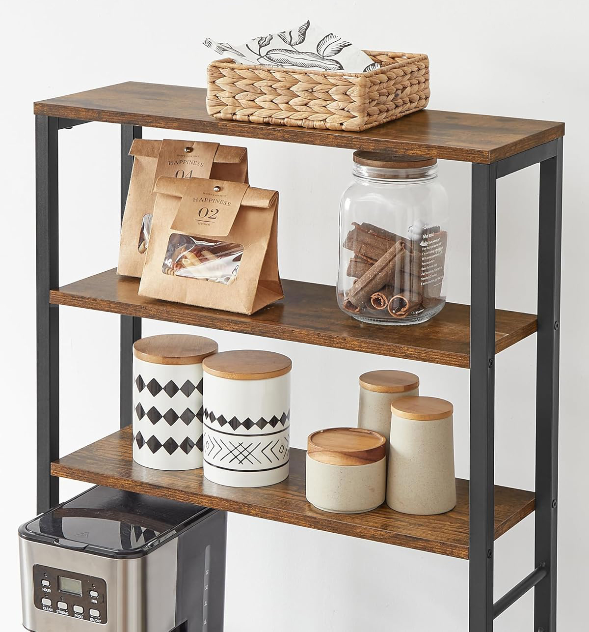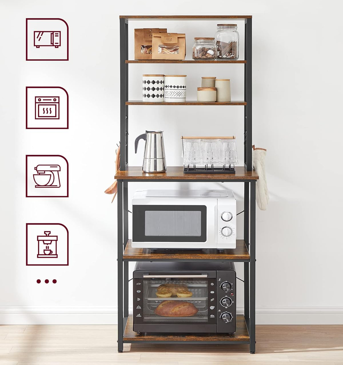 Specificatii: Culoare: Maro rustic, Negru Material: Placi aglomerate, otel Dimensiunea produsului: 40 x 60 x 167 cm (D x W x H) Greutatea produsului: 16,1 kg Max. Capacitatea de incarcare statica a fiecarui raft superior: 10.4 kg Max. Capacitatea de incarcare statica a blatului central: 38,5 kg Max. Capacitatea de incarcare statica a fiecarui raft inferior: 36,2 kg Eliberati-va spatiul de pe blat cu acest raft de panificatie care se mandreste cu numeroase spatii de depozitare - 3 rafturi superioare pentru sticle, 3 rafturi inferioare mari pentru aparatele de bucatarie si 6 carlige S pentru instrumentele de gatit. Acest raft multifunctional va optimizeaza bucataria!Etajul din mijloc poate fi reglat la 2 inaltimi pentru a gazdui ustensile de inaltimi diferite, de la un blender si o friteuza cu aer la oale si cratite.Combinand un cadru solid din otel cu placi aglomerate durabile, acest raft de depozitare pentru bucatarie este puternic si solid pentru a va tine cuptorul cu microunde, aparatul de cafea si alte accesorii.Avand 40 x 60 x 167 cm, acest raft de bucatarie cu 6 niveluri se potriveste perfect pentru bucatariile compacte sau functioneaza excelent ca un mini bar de cafea, permitandu-va sa va folositi pe deplin spatiul. Cu picioarele reglabile, aceasta unitate de raft poate ramane intotdeauna stabila pe podea, fara a o zgaria.