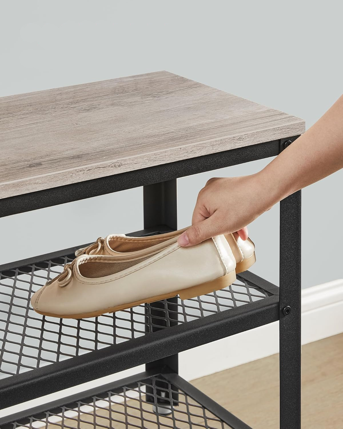 Specificatii tehnice: Brand: VASAGLE Tip produs: Etajera pantofi cu banca Material: PAL, metal Cadru: Metalic Culoare: Gri + negru Dimensiuni: 100 x 30 x 45 cm Greutate maxima suportata: 90 kg Numar rafturi: 2 Stil picioare: Standard Scurta descriere: Aceasta bancuta pentru pantofi VASAGLE imbina utilul cu esteticul. Cu doua rafturi metalice incapatoare si un blat superior robust, iti ofera o solutie practica si eleganta pentru organizarea pantofilor si a accesoriilor din hol sau living. Caracteristici principale: Design industrial cu finisaj gri si cadru negru 2 rafturi metalice pentru 8-10 perechi de incaltaminte Blat superior solid, ideal pentru asezat Structura robusta din metal si PAL Montaj simplu cu instructiuni ilustrate Picioare reglabile pentru stabilitate optima
