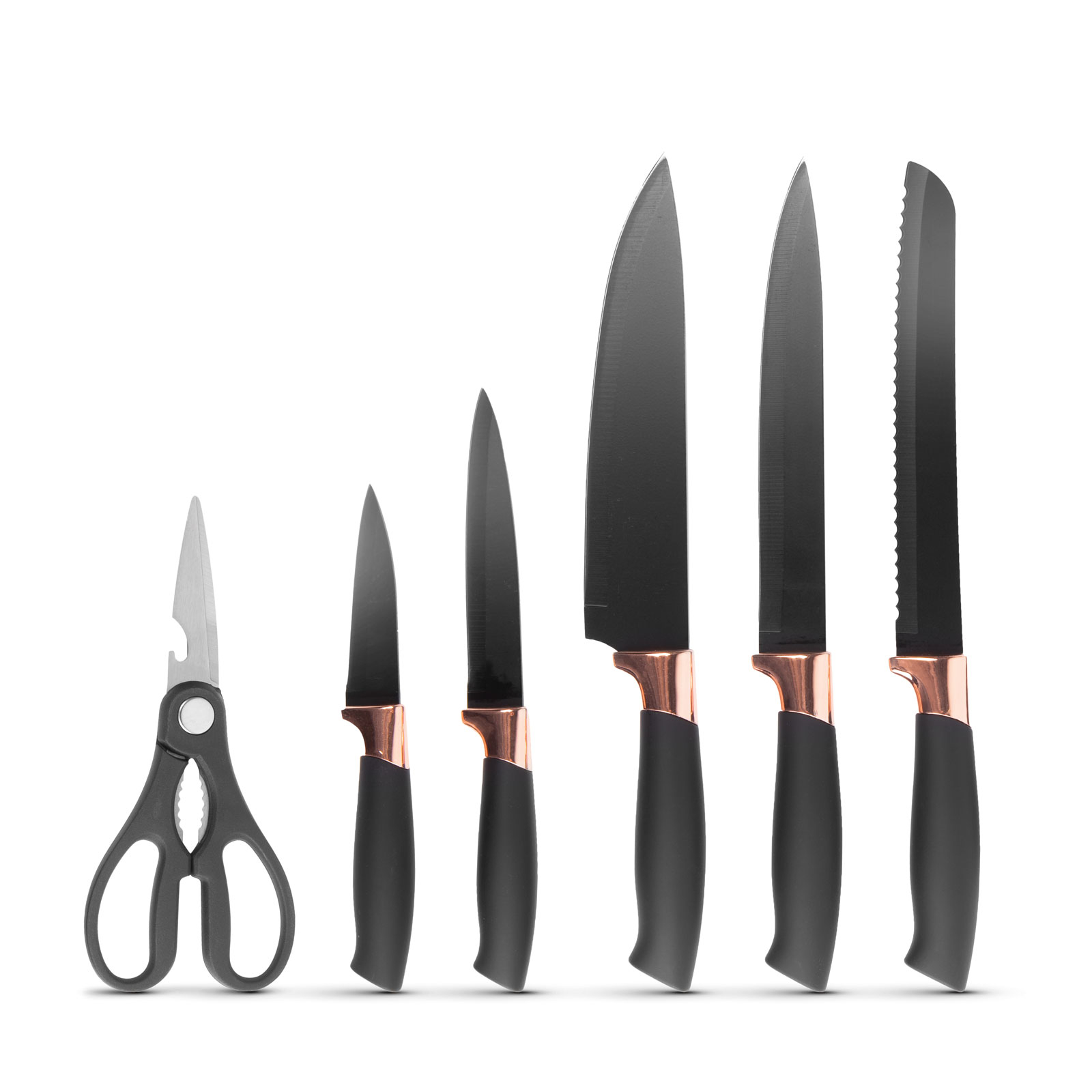 Cuțitele sunt fabricate din oțel inoxidabil de înaltă calitate, cu o margine ascuțită și un vârf ascuțit pentru a face orice sarcină de tăiere sau feliere o ușoară. Diferitele cuțite - feliere, tăiere, curățare, tăietor de pâine - permit lucrul precis și eficient în bucătărie. Culorile auriu roz și negru mat conferă eleganță cuțitelor.