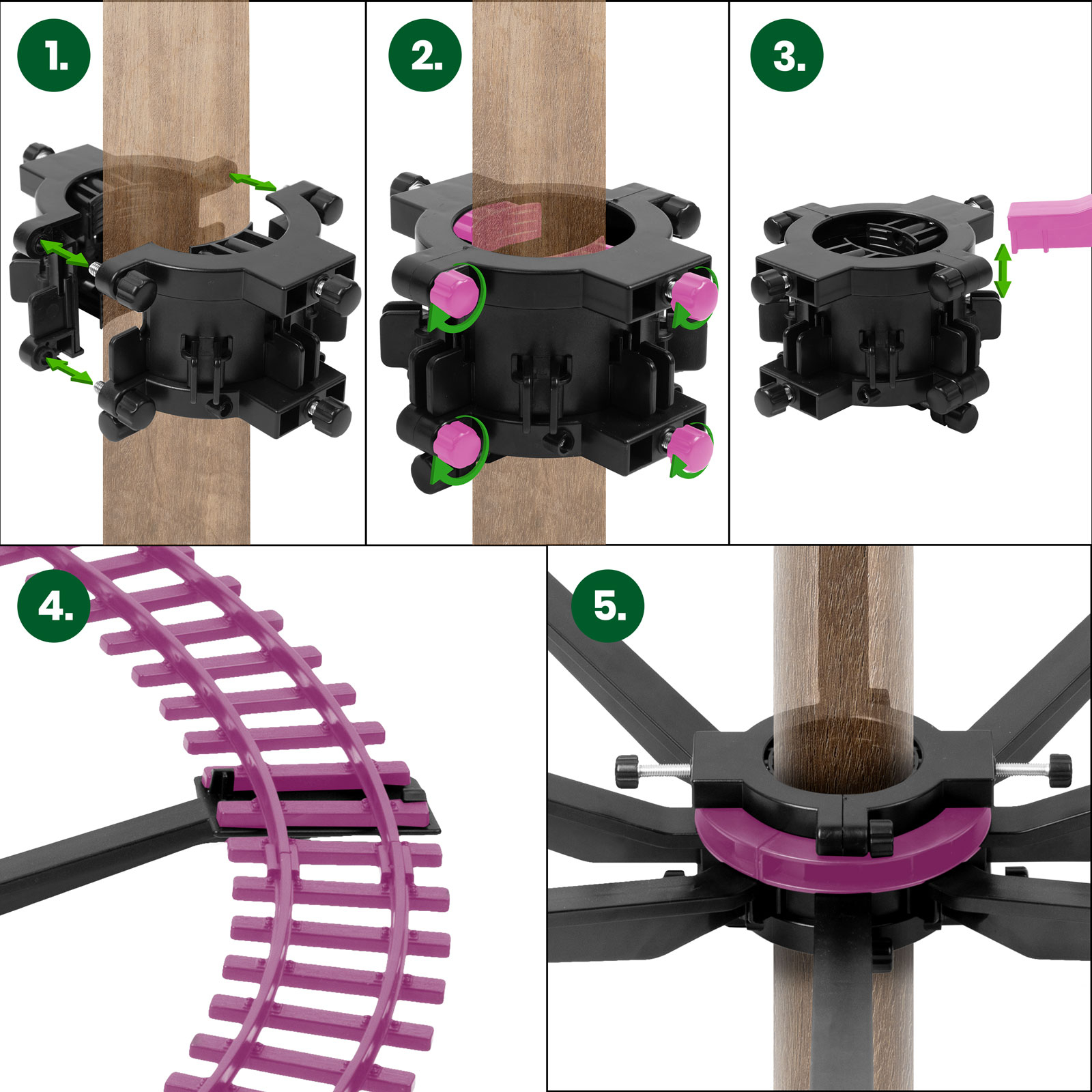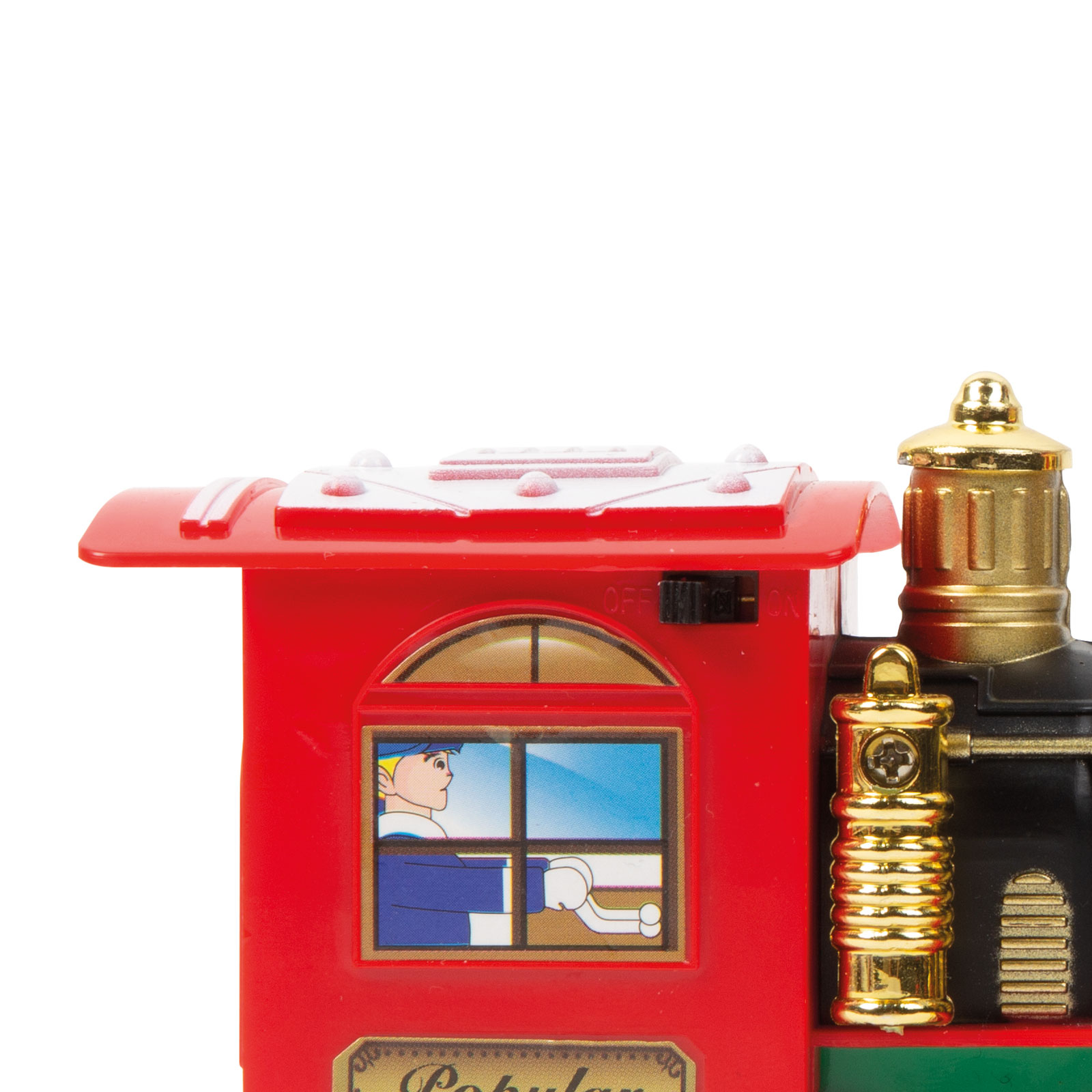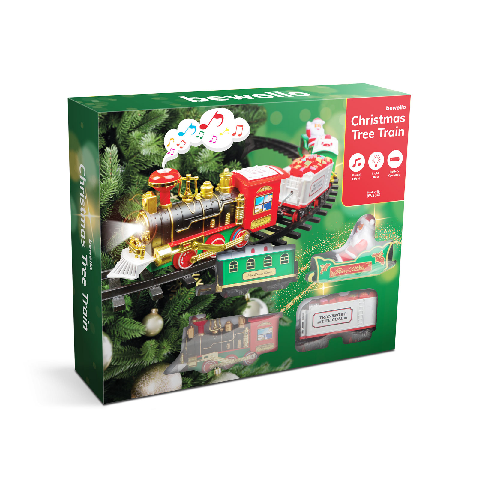 Fă-ți bradul de Crăciun unic și special cu acest tren de montat în brad. Poți fixa șinele trenului de orice stâlp, trunchi, pin cu un dispozitiv de prindere. Locomotiva se aprinde, bubuie, o experiență magică pentru întreaga familie în timp ce dispare printre ornamentele pinului, trăgând vagoanele și sania lui Moș Crăciun.