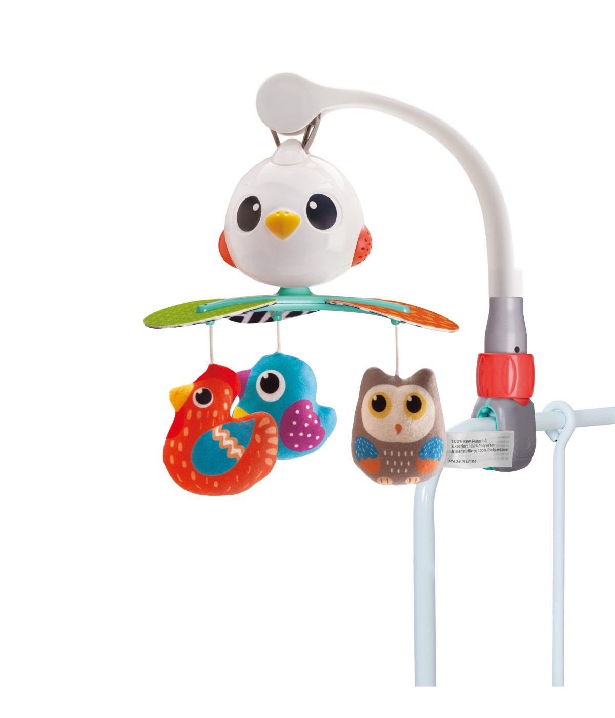 Carusel muzical cu pasari cu cadru ce poate fi rotit la 360 de grade. Cu 10 melodii linistitoare care pot fi redate continuu timp de pana 30 de minute. Culorile atrag privirile celui mic, starnindu-i curiozitatea si dorinta de a invata. Sunetele si melodiile emise de catre aceasta ii starnesc curiozitatea, descoperind noi moduri de a se juca. Caruselul se poate roti si fara activarea melodiei.