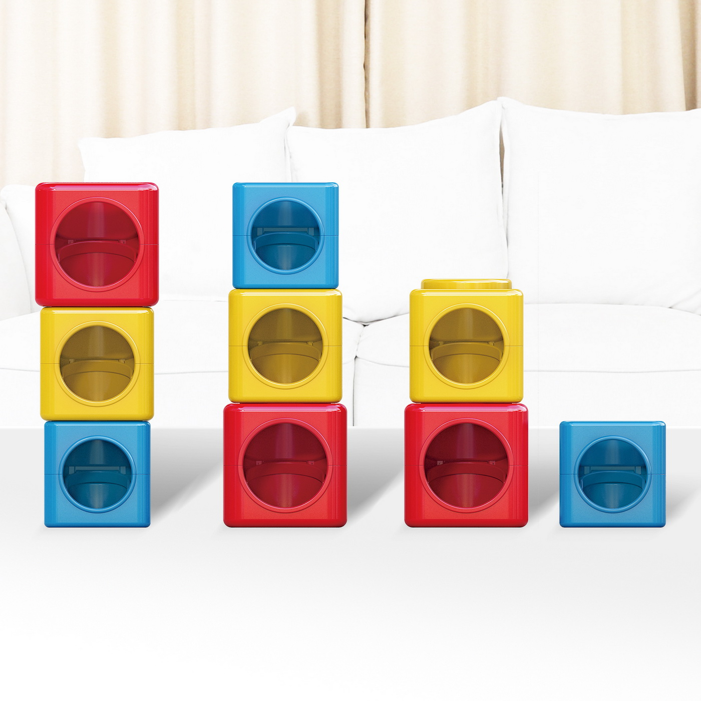 Sferele cu coduri de culori variaza in diametru si ies din blocul corespunzator, introducandu-va copilul in conceptul de sortare. Procesul de sortare ajuta la antrenarea gandirii spatiale, in timp ce imaginile de pe blocuri il invata pe copilul tau despre relatia dintre numere si cantitati.