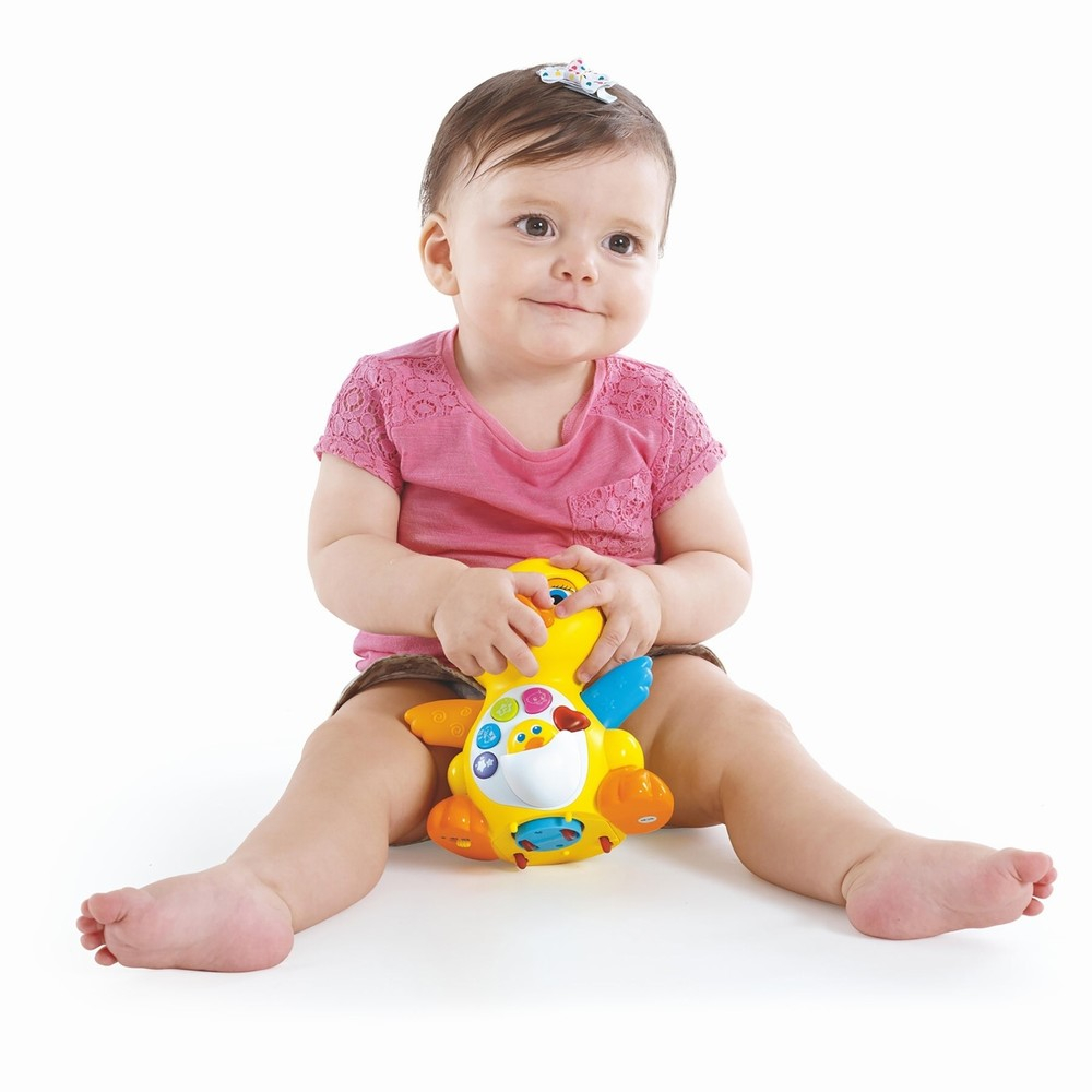 Ratusca dansatoare interactiva de la Hola Toys este gata de joaca! Apasa butonul de pe capul ei si ratusca incepe sa se miste, sa cante, sa de din aripi si i se aprind luminite. Muzica si culorile vii sunt atractive pentru cei mici care nu se vor plictisi usor de aceasta jucarie. Ratusca are cinci butoane care activeaza diverse actiuni ale jucarei. Acestea pot declansa sunete de ratusca, diverse melodii sau un sunet care imita bataile inimii. Pachetul contine si un boboc care imita sunete de ratusaca si lumineaza aripile mamei atunci cand stau alaturi.Sunetul poate fi ajustat pe mut daca vreti ca cel mic sa se joace in liniste. Atunci cand canta, ratusca stie sa clipeasca iar cand scoate sunete ciocul se inchide si se deschide. Toate aceste optiuni fac ca jucaria sa fie extrem de realista si interectiva. Ratusa stie sa cante 7 melodii.