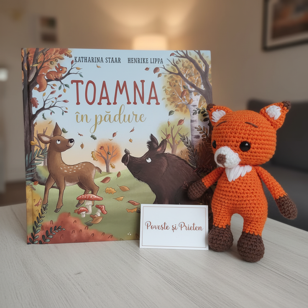 Pachet educativ copii: carte ilustrată „Toamna în pădure” + vulpiță croșetată