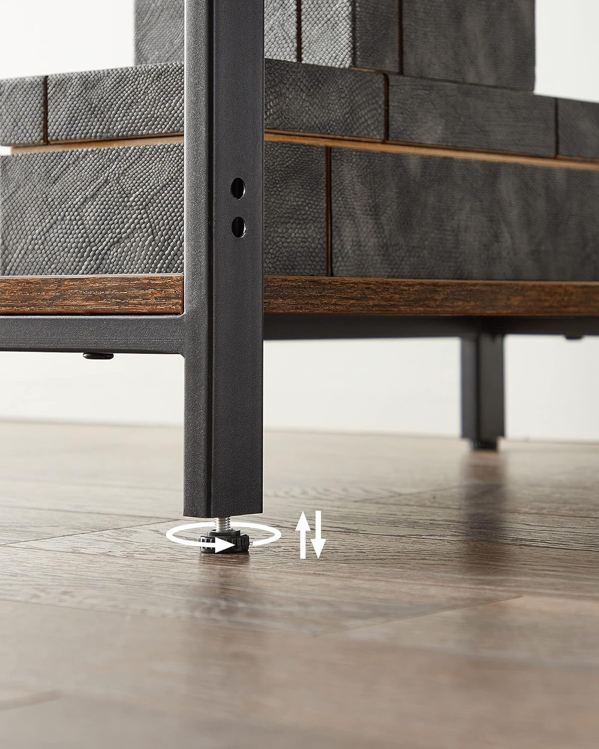Specificatii: Culoare: Maro rustic, negru Material: Placi aglomerate, otel Dimensiunea produsului: 50 x 100 x 75 cm (D x L x H) Greutatea produsului: 11,7 kg Despre acest articol Rafturi de depozitare flexibile: 2 rafturi de depozitare, dintre care unul este detasabil, pot fi instalate in dreapta sau in stanga, dupa cum aveti nevoie. In plus, puteti indeparta raftul din mijloc pentru a va potrivi calculatorul sau il puteti pastra pentru a depozita carti, fisiere sau alte obiecte utilizate frecvent.Spatiu mare pe birou: Cu un birou de 50 x 100 cm, acest birou de calculator gazduieste 2 monitoare de calculator, o tastatura si alte elemente esentiale pentru birou, oferindu-va in acelasi timp suficient spatiu de lucru, mentinandu-va productiv atunci cand lucrati de acasa.Solid si durabil: Cadrul solid din otel si placile aglomerate de calitate fac ca acest birou sa fie stabil si durabil. Asa ca nu ezitati sa puneti pe el tot ceea ce aveti nevoie pentru munca, studiu sau recreere, acest birou poate face fata!Picioare reglabile practice: Picioarele reglabile mentin biroul stabil pe podele usor inegale si va protejeaza podeaua de zgarieturi.Usor de asamblat: Instructiunile detaliate si piesele clar etichetate va ajuta sa montati acest birou de scris cu rafturi usor si rapid.