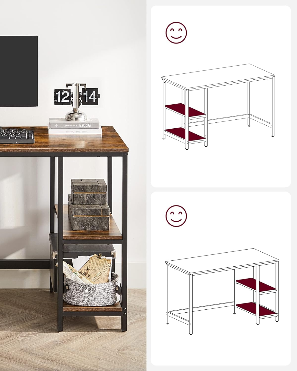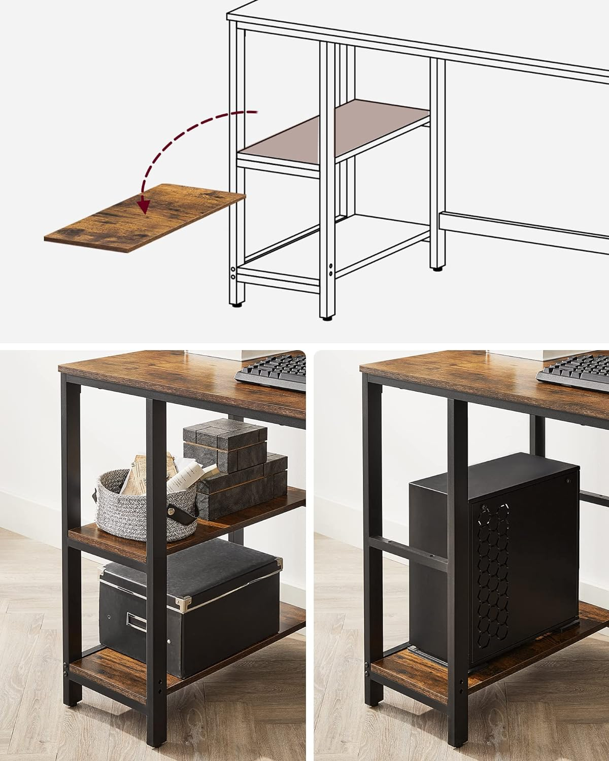 Marca: VASAGLE Dimensiuni produs: 60D x 120L x 75H cm Culoare: maro rustic + negru Stil: industrial Material de baza: Otel aliat Despre acest articol Rafturi de depozitare flexibile: 2 rafturi de depozitare, dintre care unul este detasabil, pot fi instalate in dreapta sau in stanga, dupa cum aveti nevoie. In plus, puteti indeparta raftul din mijloc pentru a va potrivi turnul de calculator sau il puteti pastra pentru a depozita carti, fisiere sau alte obiecte utilizate frecvent.Spatiu mare pe birou: Cu un birou de 60D x 120W cm, acest birou de calculator gazduieste 2 monitoare de calculator, o tastatura si alte elemente esentiale pentru birou, oferindu-va in acelasi timp suficient spatiu de lucru, mentinandu-va productiv atunci cand lucrati de acasa.Robust si durabil: Cadrul robust din otel si placile aglomerate de calitate fac ca acest birou de birou sa fie stabil si durabil. Asa ca nu ezitati sa puneti pe el tot ceea ce aveti nevoie pentru munca, studiu sau recreere, acest birou poate face fata!Picioare reglabile practice: Picioarele reglabile mentin biroul de scris stabil pe podele usor inegale si va protejeaza podeaua de zgarieturi. Nu mai exista clatinari enervante care sa va deranjeze atunci cand sunteti cufundat in munca sau studiu.Usor de asamblat: Instructiuni detaliate si piese clar etichetate sunt furnizate pentru a va ajuta sa montati acest birou de scris cu rafturi usor si rapid, economisindu-va timpul, efortul, precum si energia.