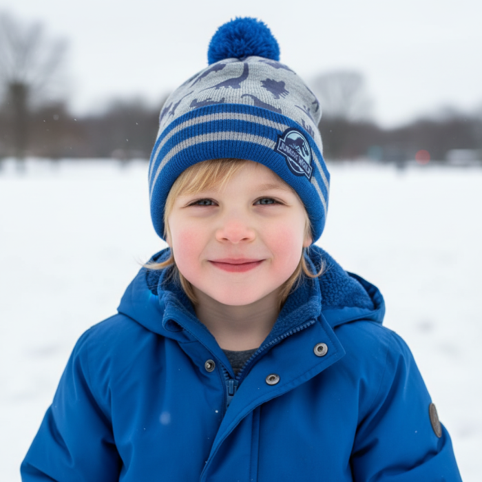 Căciulă pentru copii Jurassic World Grey, mărimea 52 cm, cu imprimeu dinozauri și pompon albastru. Produs oficial.