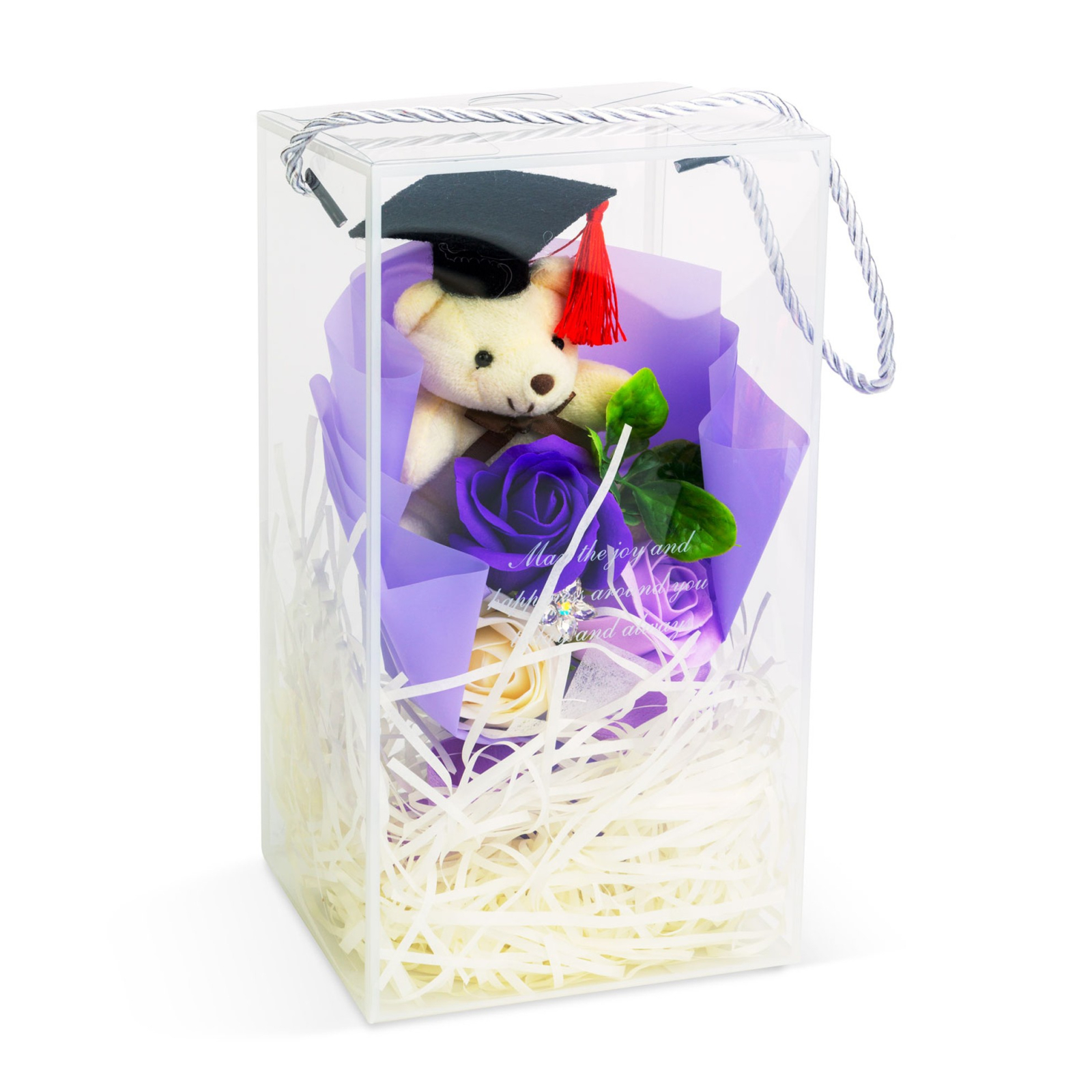 Pachetul conține un ursuleț de pluș adorabil și un trandafir, ambele ambalate în hârtie mată, cu un aspect elegant. Întreaga compoziție este livrată într-o cutie de plexiglas, al cărei fund este umplut cu fâșii de hârtie albă, accentuând nota de exclusivitate.