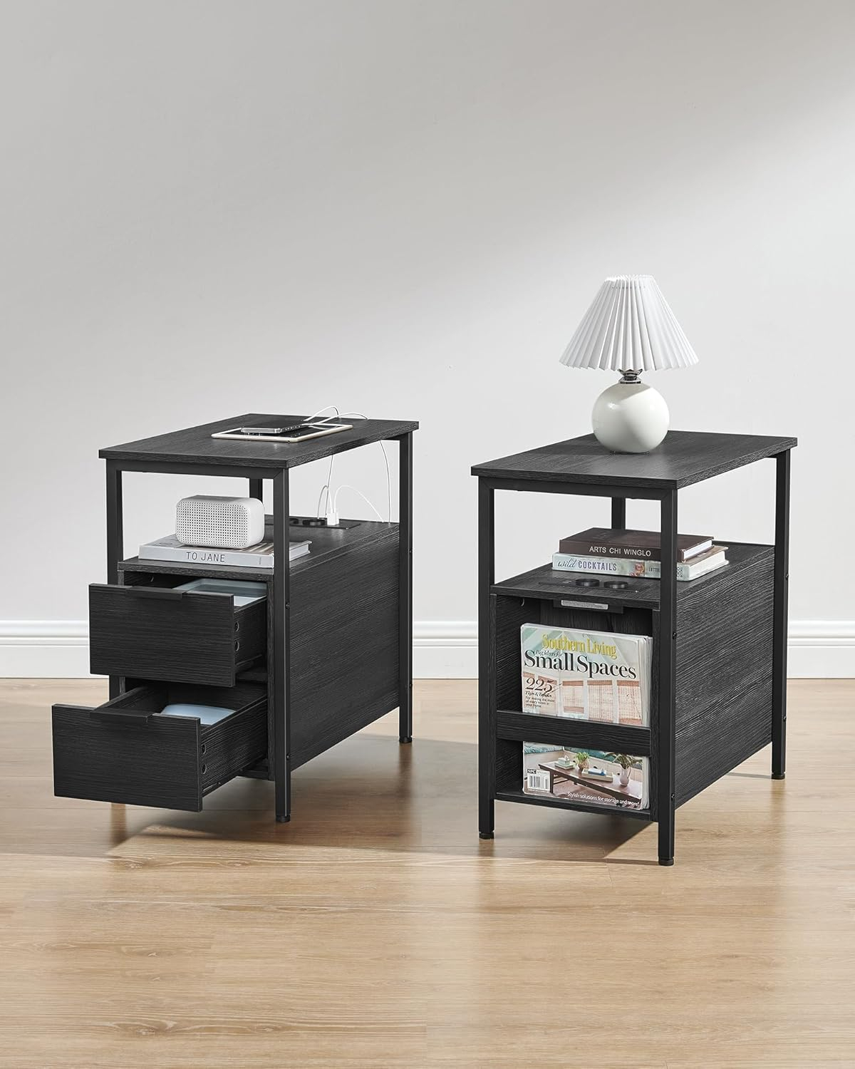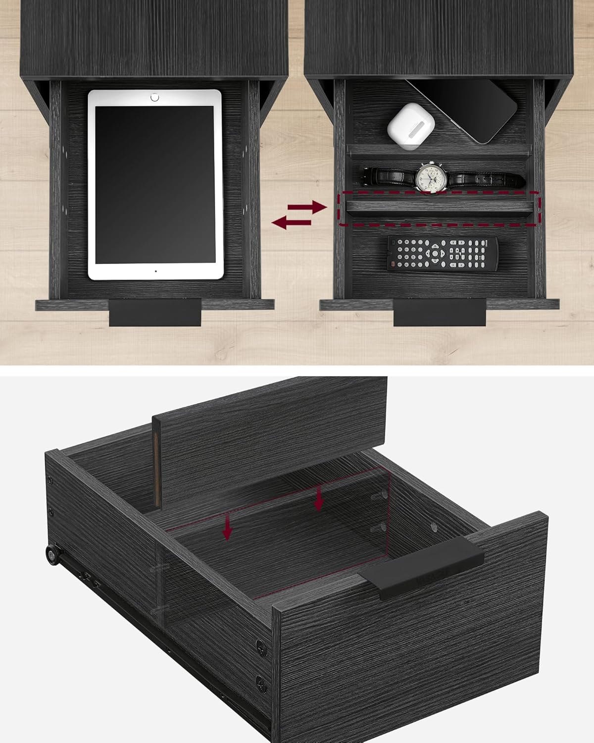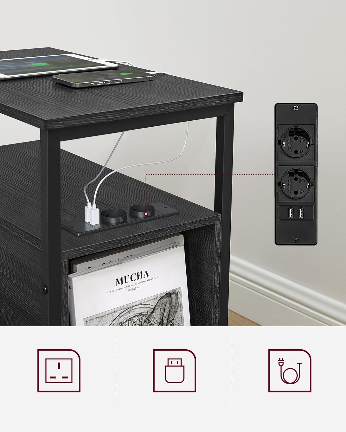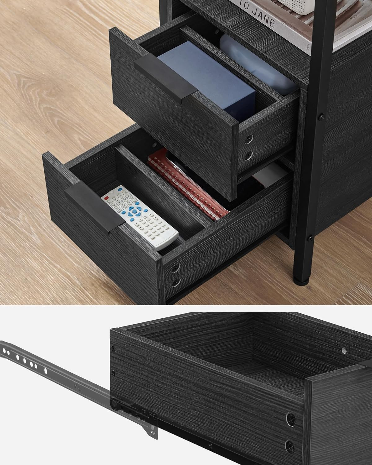 Specificatii tehnice Tip produs: Noptiera / masuta laterala Material: PAL, otel Culoare: Gri antracit + negru Dimensiuni: 60 x 35 x 61 cm Capacitate maxima statica totala: 91 kg Capacitate per sertar: 2,3 kg Capacitate raft intermediar: 11,3 kg Capacitate suport reviste: 2,3 kg Numar sertare: 2, cu separatoare detasabile Rafturi deschise: 2 Functii speciale: Priza incorporata (2 prize AC + 2 porturi USB), cablu de 2 m Picioare reglabile: Da Montaj: Necesita asamblare Cod produs: LET325B22 Scurta descriere Noptiera VASAGLE cu 2 sertare, rafturi si priza incorporata este perfecta pentru dormitoare moderne sau livinguri compacte. Designul inteligent include porturi USB, prize AC si spatii bine compartimentate, inclusiv un suport pentru reviste. Fabricata din PAL rezistent si otel, sustine pana la 91 kg si se monteaza rapid. Caracteristici principale Priza integrata cu 2 porturi AC si 2 USB 2 sertare cu separatoare detasabile pentru organizare eficienta 2 rafturi deschise si suport reviste pe spate Constructie solida din PAL si otel Picioare reglabile pentru stabilitate pe orice suprafata Design compact, ideal pentru spatii mici Manere superioare pentru transport facil Usor de curatat si rezistenta la umezeala