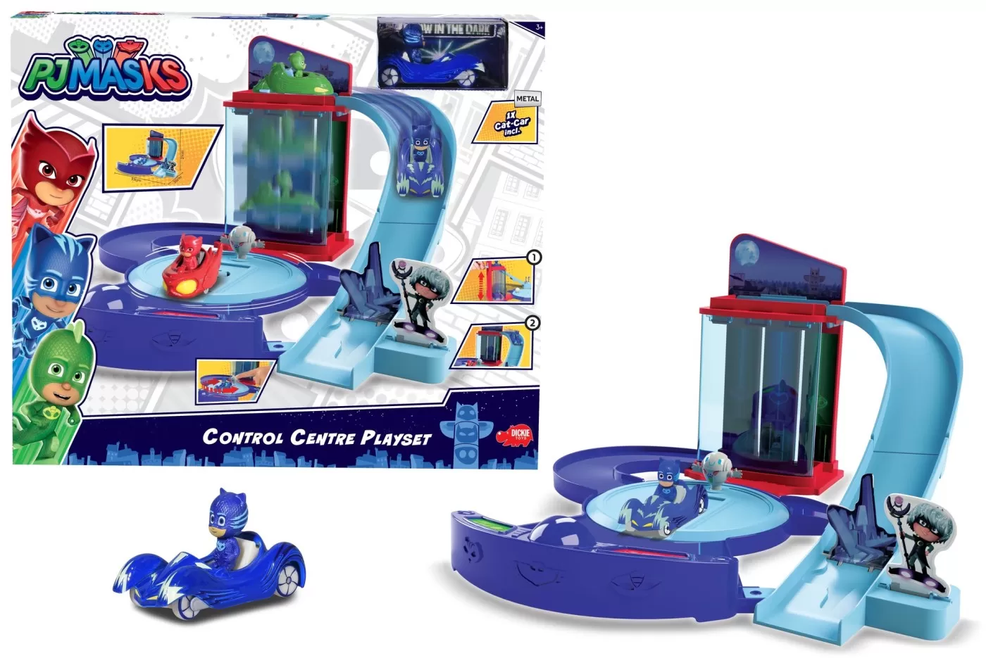 Centrul de comanda Eroi in Pijamale, cu multe functii distractive, cu lift si o masinuta de metal Cat inclusa si figurina, scara masinuta. Eroi in Pijama Control Centre de la Dickie Toys are o multime de aventuri pe care sa le descoperi cu eroii tai preferati. Pista permite lansarea unui vehicul din lift pe o rampa la capatul careia se afla o bariera ce se poate actiona manual. Pista are o placa turnanta manuala si un lift manual si ofera spatiu pentru cei trei eroi din cabina de pilotaj. Setul include o masina de jucarie de inalta calitate, cu volan liber in design Catboy si este, prin urmare, gata de pornire imediata.