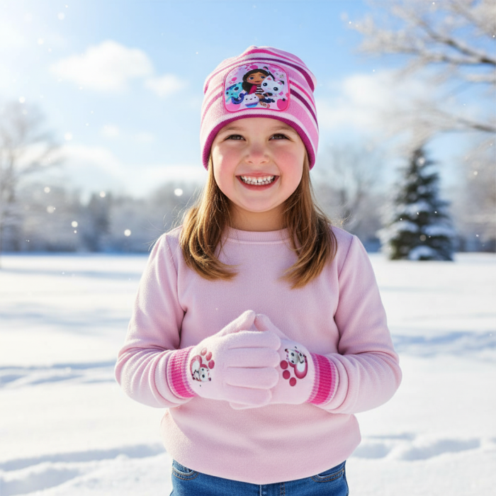 Gabby's Dollhouse Cuddle Paws set căciulă + mănuși pentru copii cu licență oficială Gabby este un set căciulă și mănuși pentru sezonul rece. Materialul moale și călduros protejează împotriva frigului, iar designul cu personaje îndrăgite face ca accesoriile de iarnă să fie purtate cu plăcere. Setul este ideal pentru plimbări zilnice sau drumuri spre școală.