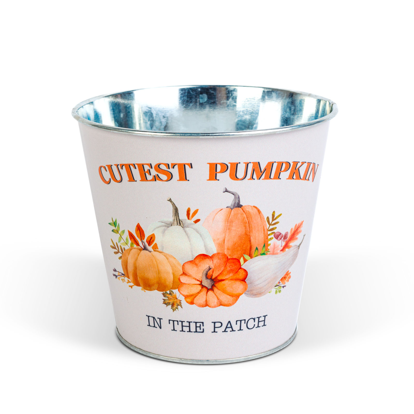 Adaugă o notă veselă și caldă decorului tău cu acest ghiveci decorativ metalic, decorat cu model de dovleac și inscripția „Cutest pumpkin in the patch”. Realizat în stil rustic, cu finisaje atent lucrate, ghiveciul este un element ideal pentru a completa aranjamentele de masă, decorurile de sezon sau cadourile creative.