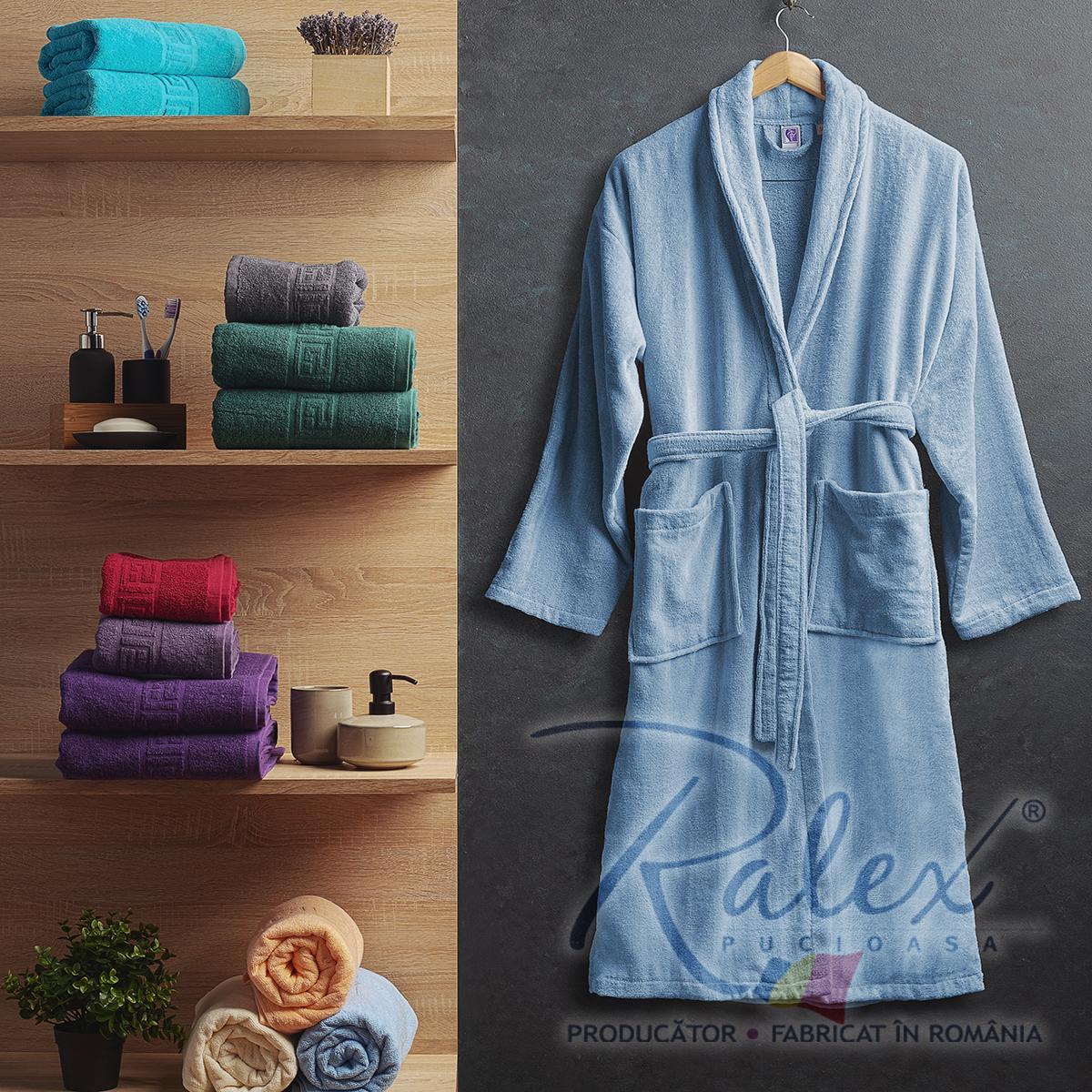 Halatul din velur se adreseaza persoanelor cu cele mai exigente si elegante gusturi. Este un produs care combina calitatea înalta si stilul perfect. Pentru a crea o atingere moale, catifelata, buclele de pe partea din fata au fost taiate. La interiorul halatului se pastreaza "bucla" textura de bumbac si astfel ramâne în întregime absorbant.