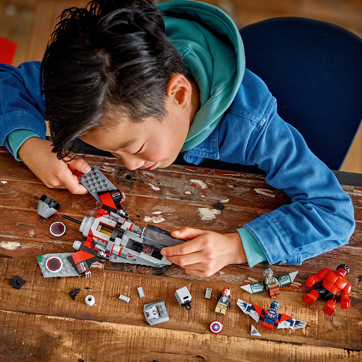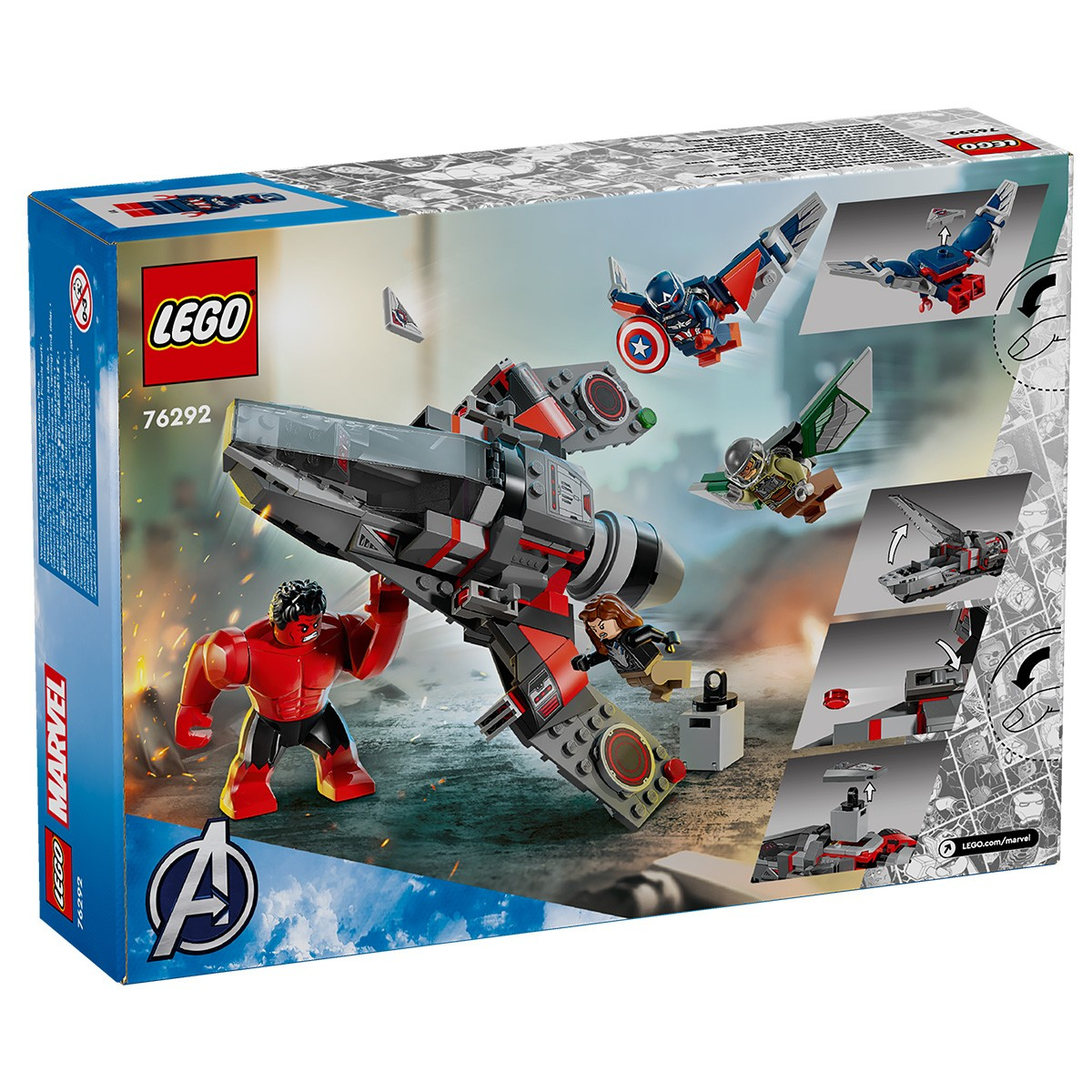 Fanii filmelor de actiune vor adora detaliile autentice si minifigurinele populare incluse in LEGO® Marvel Batalia dintre Capitanul America si Hulk rosu (76292). Acest set de construit cu Super Eroi pune aventurile lui Captain America la inaltime, direct in mainile baietilor si fetelor in varsta de 7 ani si mai mari. Aceasta jucarie cu avion de lupta construibil include o distributie impresionanta de personaje Captain America si Falcon (ambii cu aripi care se deschid) Hulk Rosu si Ruth Bat-Seraph. Cu o carlinga care se deschide cu loc pentru o minifigurina pilot, avionul este usor de tinut de catre copiii, care il pot plimba prin aer in timp ce lanseaza atacuri folosind cele 2 stud shooters atasate. Sectiunea exterioara a avionului poate fi detasata pentru a dezvalui un compartiment de depozitare ascuns in spate, cu loc pentru proiectile de rezerva sau metale misterioase. Acest vehicul construibil este ideal pentru joaca independenta. Pentru un plus de distractie digitala, copiii pot mari modelul, sa il roteasca in 3D si sa-si urmareasca progresul folosind distractiva si intuitiva aplicatia LEGO Builder.