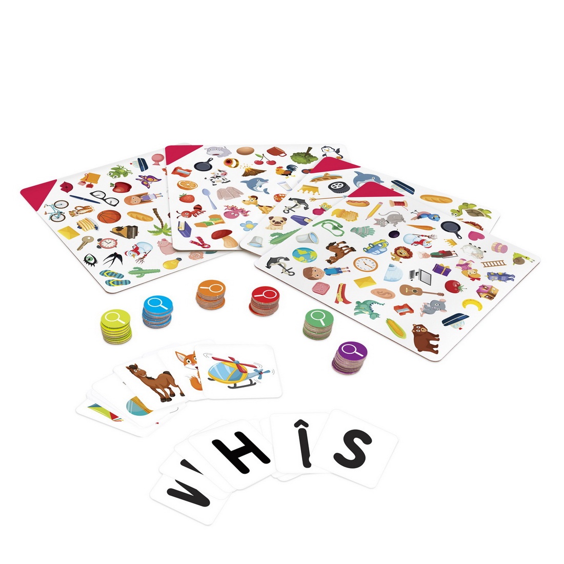 Jocul ideal de observare pentru prescolari! Cu 2 moduri de joc gasiti obiectul care incepe cu litera de pe cartonas si gasiti obiectul de pe cartonas pe tabla de joc. Cu cat gasesti mai repede obiectul, cu atat mai repede vei scapa de jetoanele din posesia ta. Cine ramane primul fara jetoane, CÂsTIGa!Valorile educationale ale jocului coordonarea mana-ochi, atentie, corelatia imagine-cuvant.Jocul contine 4 planse cu doua fete care creeaza suprafata de joc, 24 de carti cu doua fete, 48 jetoane de 6 culori, manual de instructiuni Varsta recomandata 3 ani +.