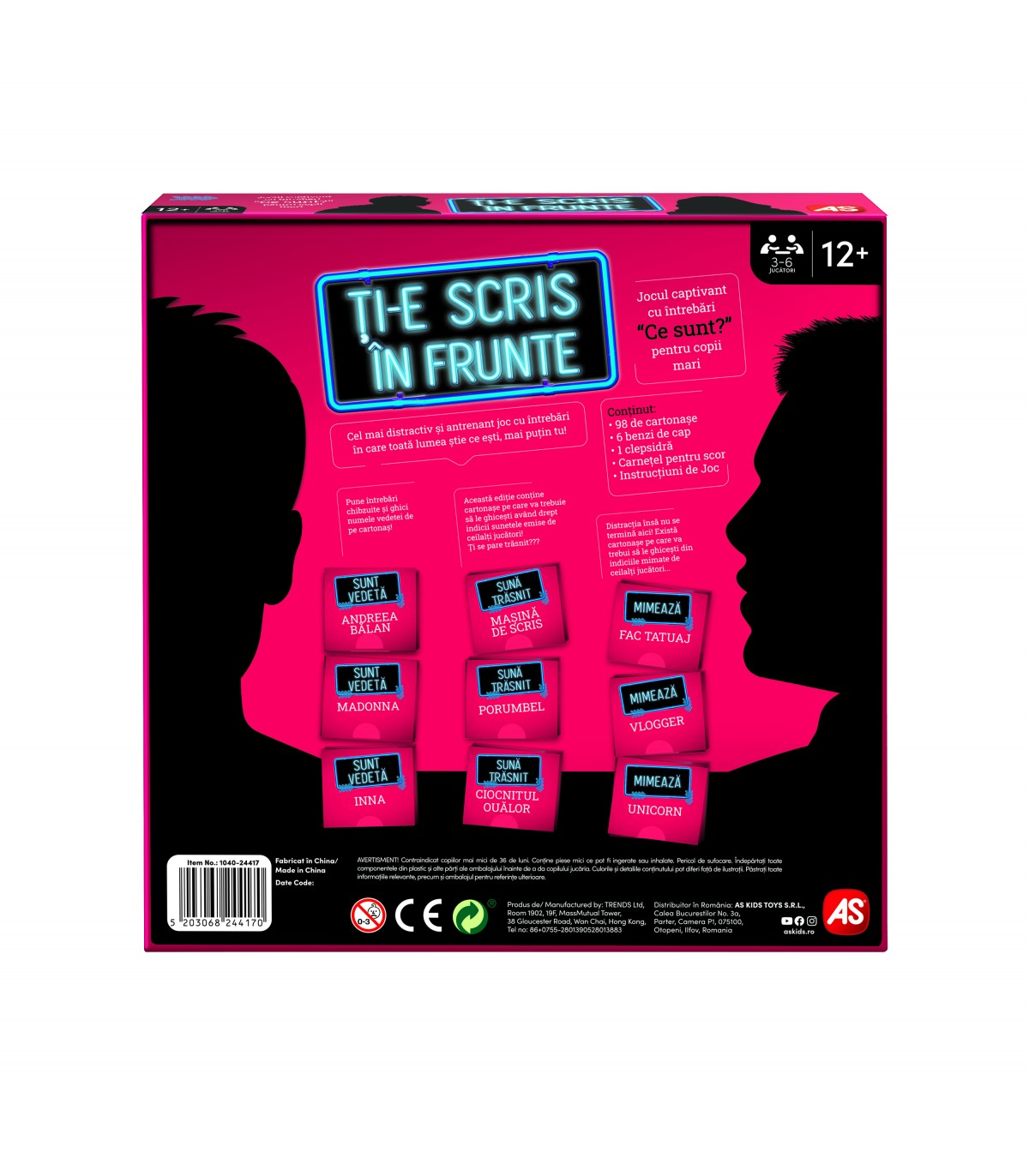Ti-e scris in frunte un joc istet si distractiv, in care jucatorii au pe frunte un cartonas ilustrat si trebuie sa ghiceasca cuvantul cu ajutorul intrebarilor adresate adversarilor. Adversarii trebuie sa raspunda cu da sau nu la intrebarile adresate, iar jucatorul trebuie sa ghiceasca cuvantul in intervalul de timp stabilit prin intoarcerea clepsidrei. Castiga jucatorul care ghiceste cele mai multe cartonase! Ti-e scris in frunte - Cel mai amuzant si cel mai rapid joc cu intrabari acum si pentru copii mari, cu 3 moduri de joc ghici cuvantul, sunetul si mai si mimezi cuvinte! Totul pentru si mai multa distractie pentru petreceri! Pentru un joc si mai antrenant, acesta se poate desfasura si pe echipe! Jocul contine cartonase, benzi de cap, jetoane, 1 clepsidra, 1 regulamentul de joc.