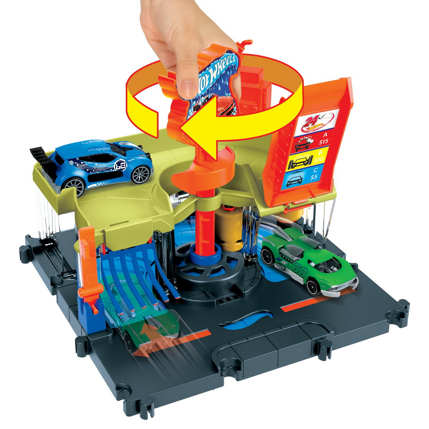 Unitatile de oras Hot Wheels le permit copiilor sa creeze propriul peisaj urban plin de cascadorii si aventuri cool. Fiecare set contribuie la tematica de inamic Hot Wheels City, incorporand elemente care sugereaza ca o creatura sta la panda in apropiere, asteptand sa se napusteasca. Toate se conecteaza la alte seturi Hot Wheels prin mai multe puncte de conexiune si fiecare include un vehicul Hot Wheels pentru joc de impins direct din cutie. Cu locuri familiare precum un atelier de reparatii, un restaurant drive-thru, o spalatorie auto si o parcare, copiii vor dori sa le colectioneze pe toate, pentru posibilitatie nenumarate de povesti. Fiecare se vinde separat, in limita stocului disponibil. Culorile si decoratiunile pot varia.Creati peisajul urban suprem, cu fiecare dintre seturile de centru urban Hot Wheels City care includ locuri usor de recunoscut si contribuie la tematica de creatura inamica. Aici au loc aventurile palpitante!Colectia include un atelier de reparatii, un restaurant drive-thru, o spalatorie auto si o parcare, iar toate seturile se conecteaza intre ele, precum si alte seturi Hot Wheels. Fiecare piesa se vinde separat.Fiecare set include 1 masina de jucarie Hot Wheels, pentru joaca si distractie imediate, direct din cutie.Copiii depasesc provocarile si isi dezvolta abilitatile de povestitori, prin joc creativ de impins.Fiecare set din colectia de centru urban Hot Wheels City este un cadou excelent pentru copii cu varste intre 4 si 8 ani si colectionari de orice varsta care adora detaliile si personalitatea marcii Hot Wheels.Acest set contine o spalatorie auto.