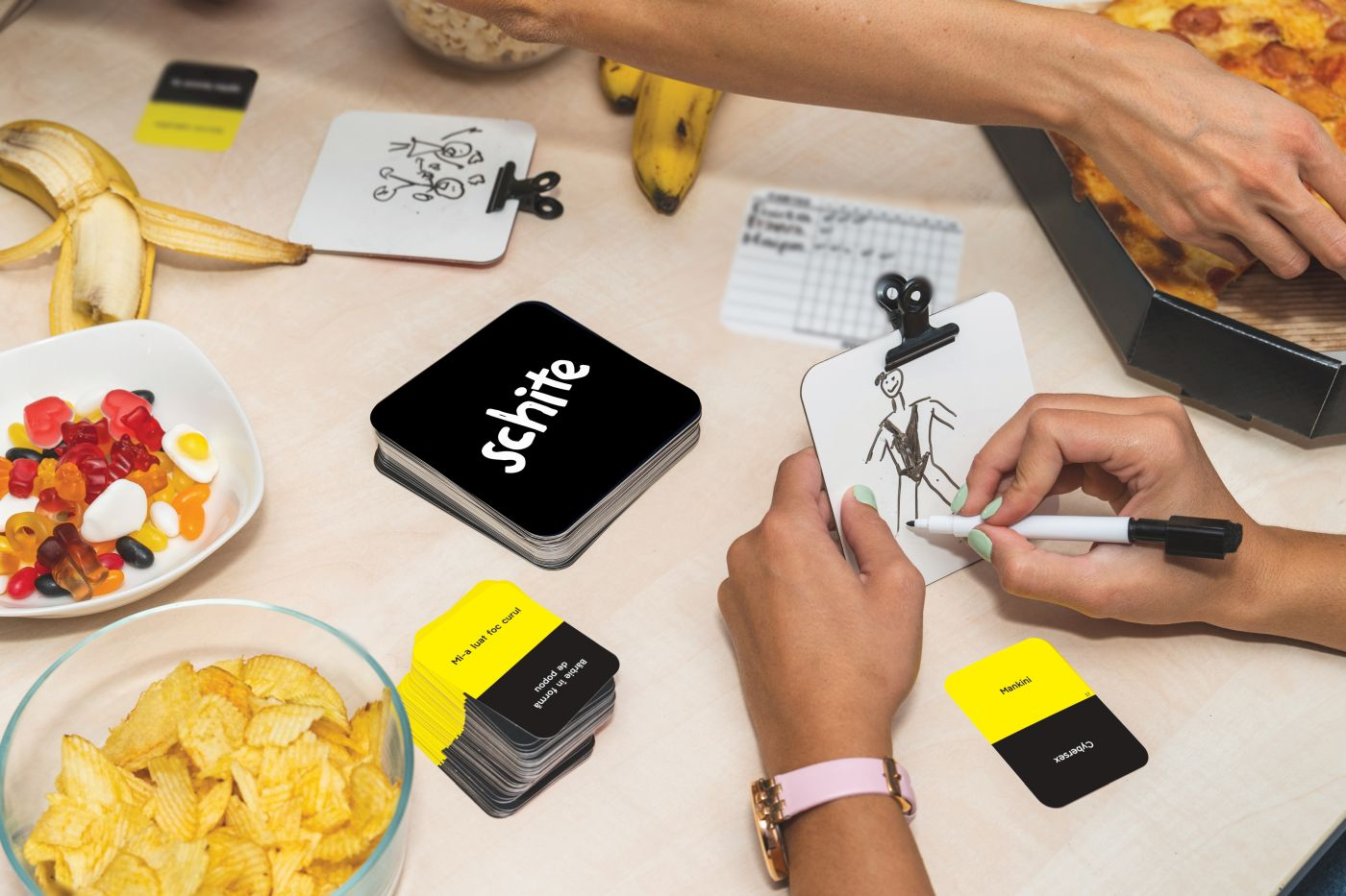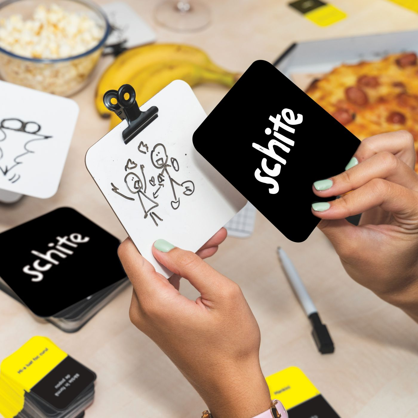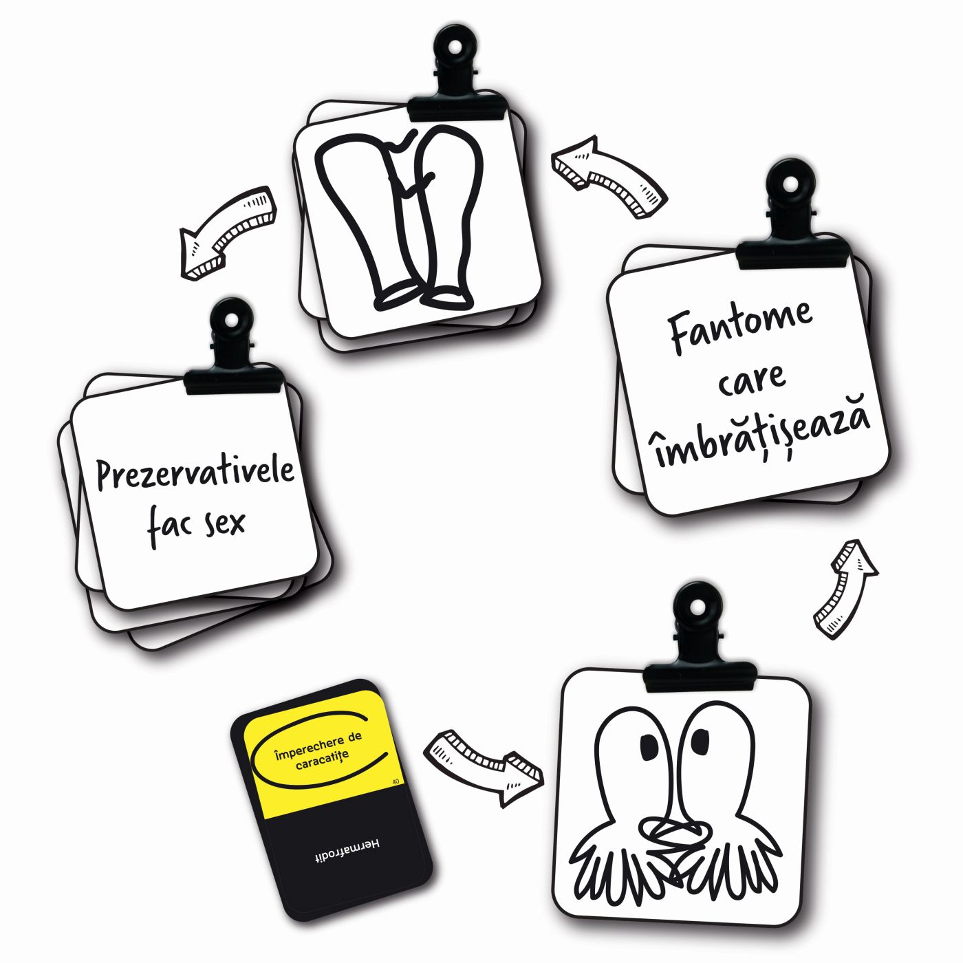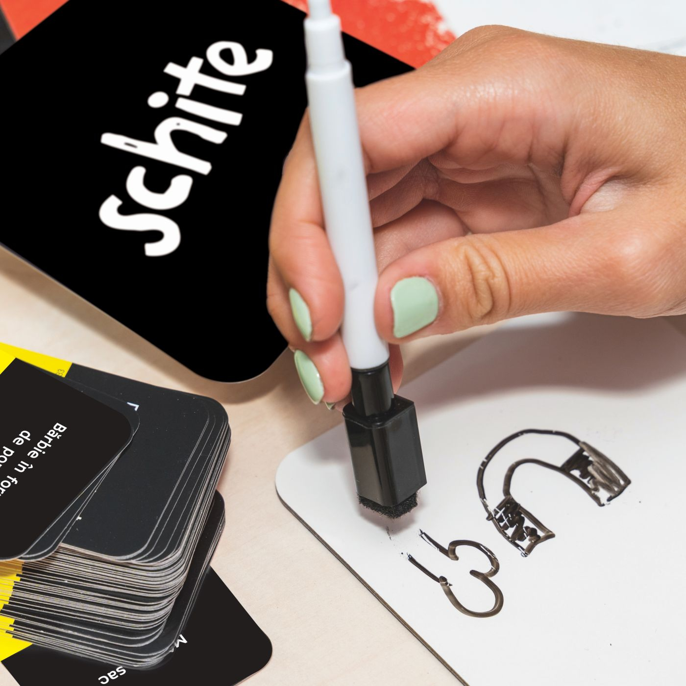 Jocul include File de design reutilizabile care se fixeaza una peste alta cu ajutorul unor clipsuri speciale. Markere de stergere. Carti cu peste 200 de subiecte uimitoare de desenat. File pentru numararea punctelor. Setul contine -6 cartonase numerotate si 6 clipsuri - 42 cartonase pentru schite -6 markere -60 de carduri (240 teme de schitat) -2 cartonase SCOR -manual cu instructiuni.