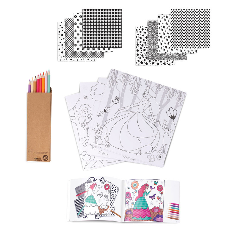 Set de pictura cu modele pentru a crea propria ta opera de arta unica. Alege un model si picteaza printesele tale preferate cu creioane colorate. Diferitele modele si culori va sporesc imaginatia pentru a crea o varietate de modele. Setul promoveaza abilitatea tactila dar si creativitatea-imaginatia. Contine 10 imagini semicolorate pretiparite, 2 coli cu modele, 8 creioane in diferite culori si un ghid de colorat detaliat pas cu pas pentru a obtine un rezultat cat mai deosebit.